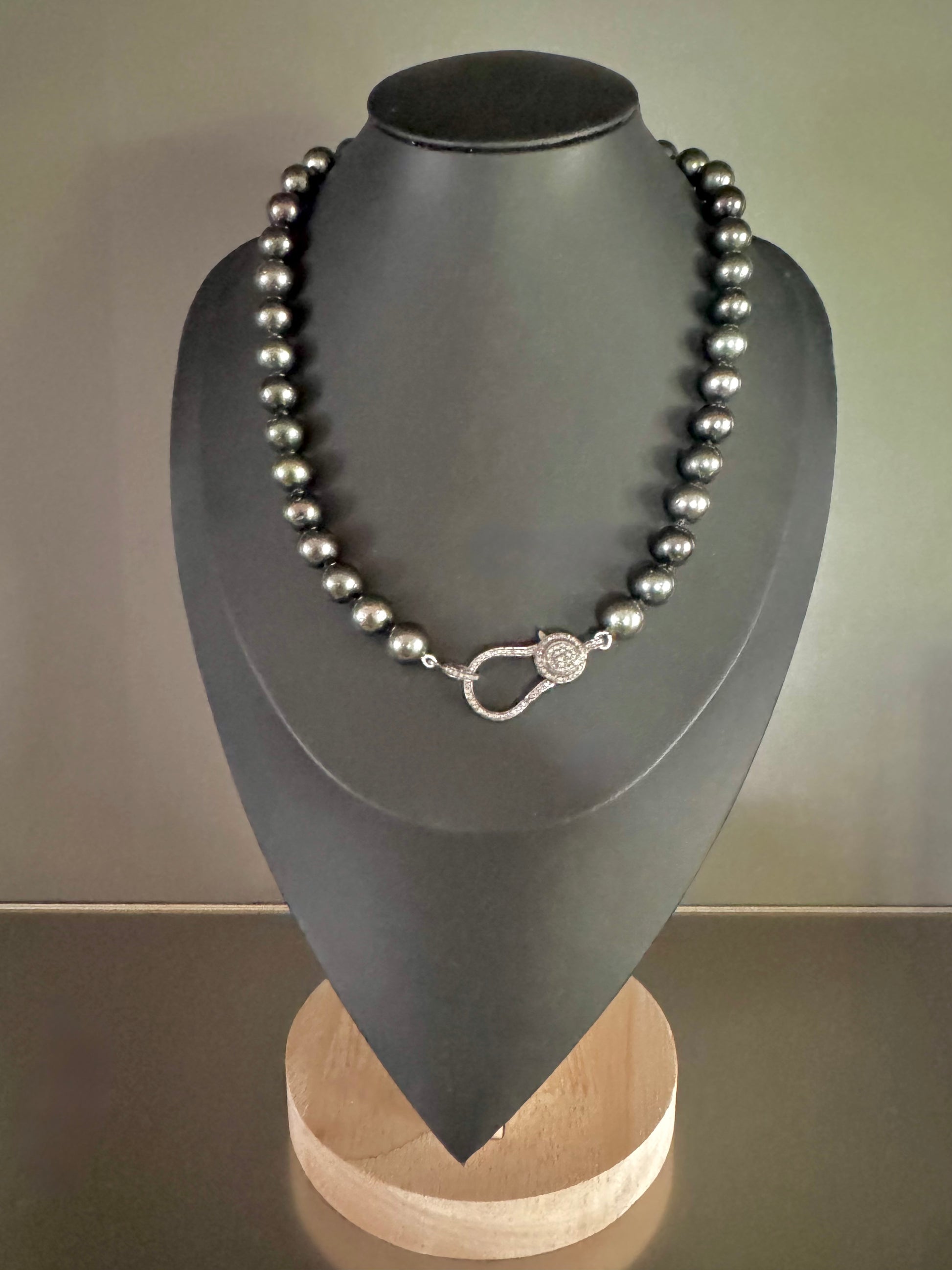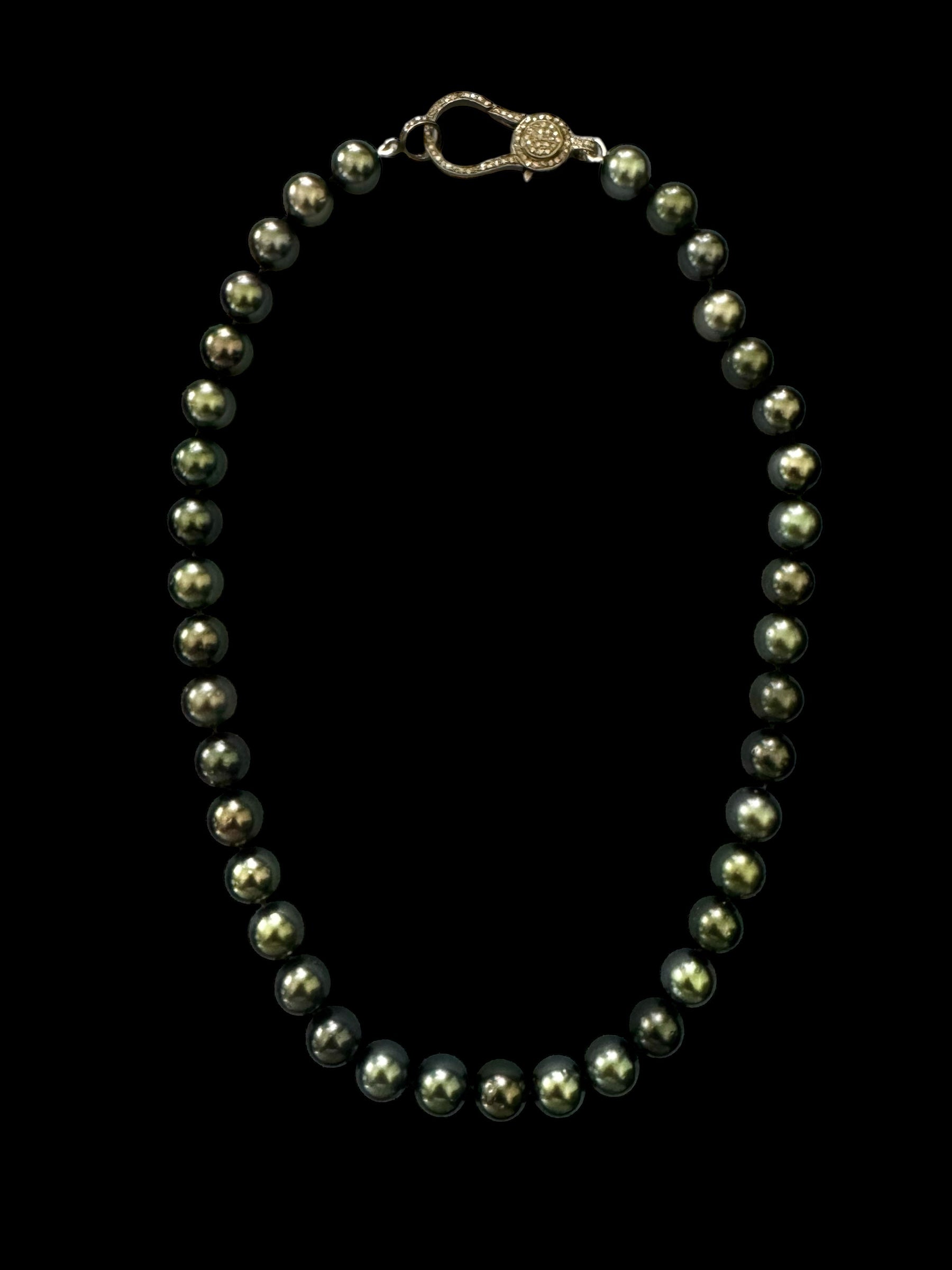 The necklace is finished with a pavé diamond clasp, adding a flash of brilliance that contrasts beautifully with the intensity of the pearls. It’s a refined yet bold statement—designed for modern collectors who favor elegance with an edge.