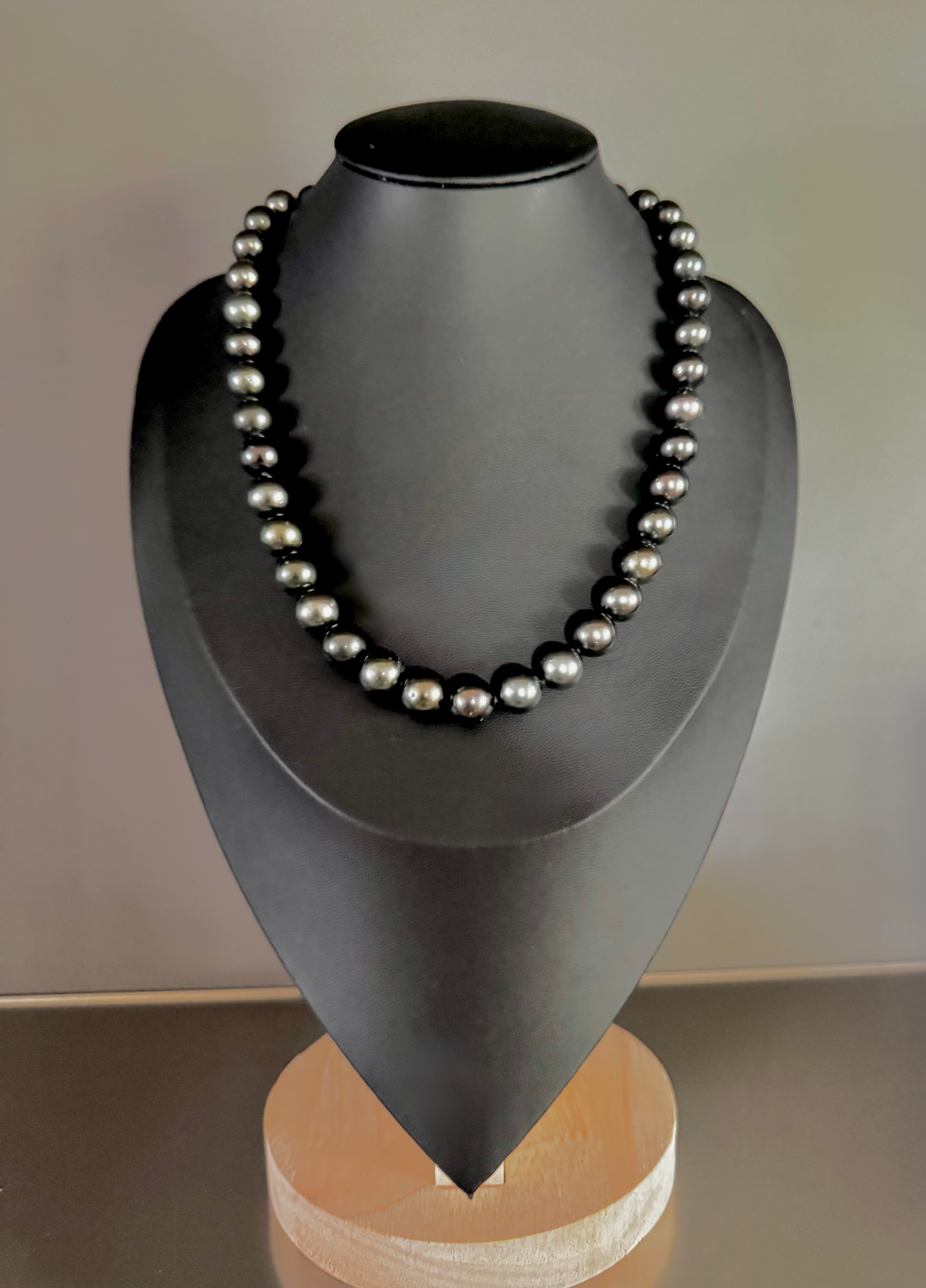 Dark, lustrous, and undeniably powerful—Black Tide features a strand of 10–11mm Tahitian pearls in deep, natural black tones with subtle flashes of green, violet, and silver. Known for their mirror-like luster and timeless allure, each pearl is hand-selected for its smooth surface and radiant depth.