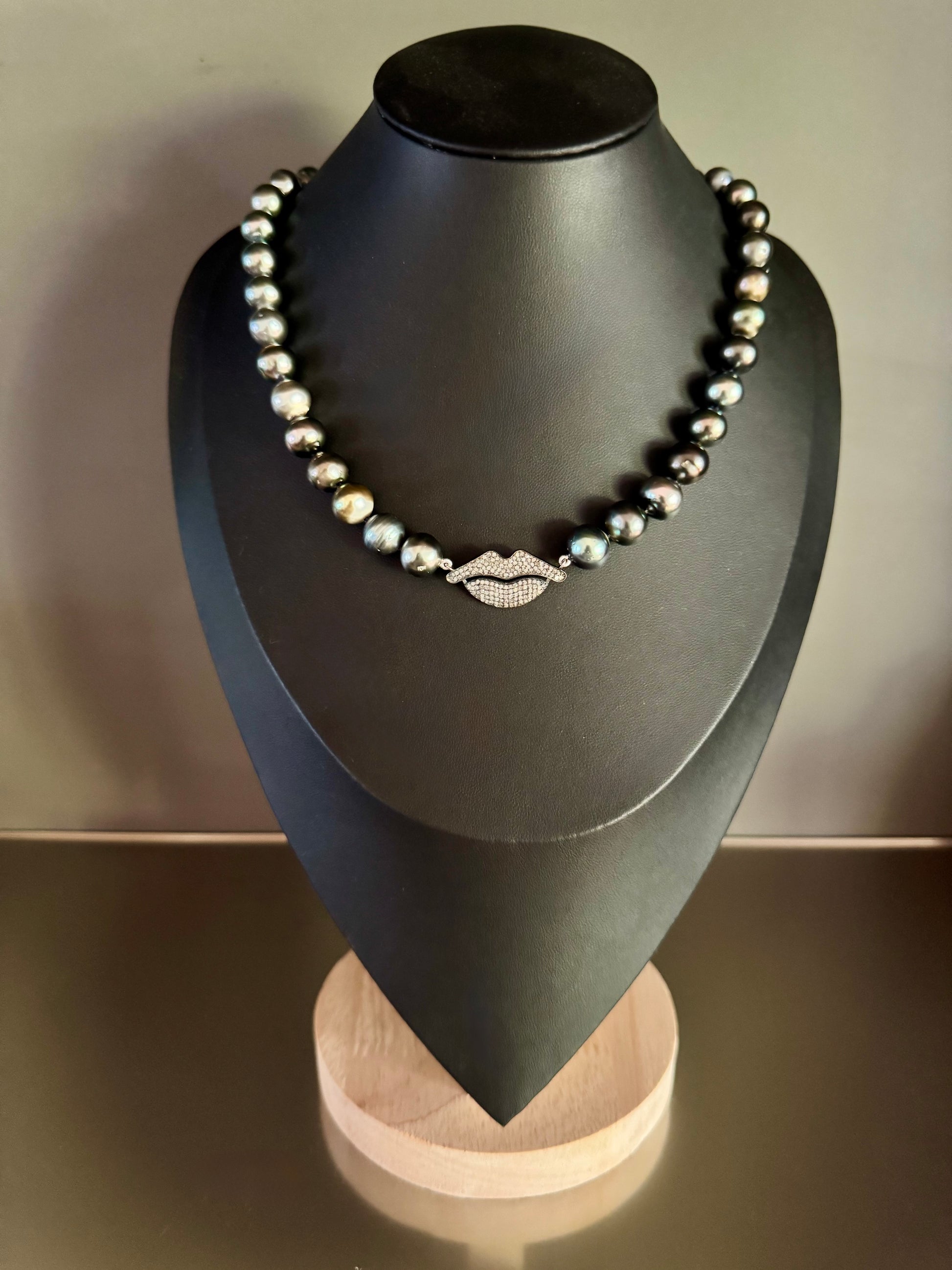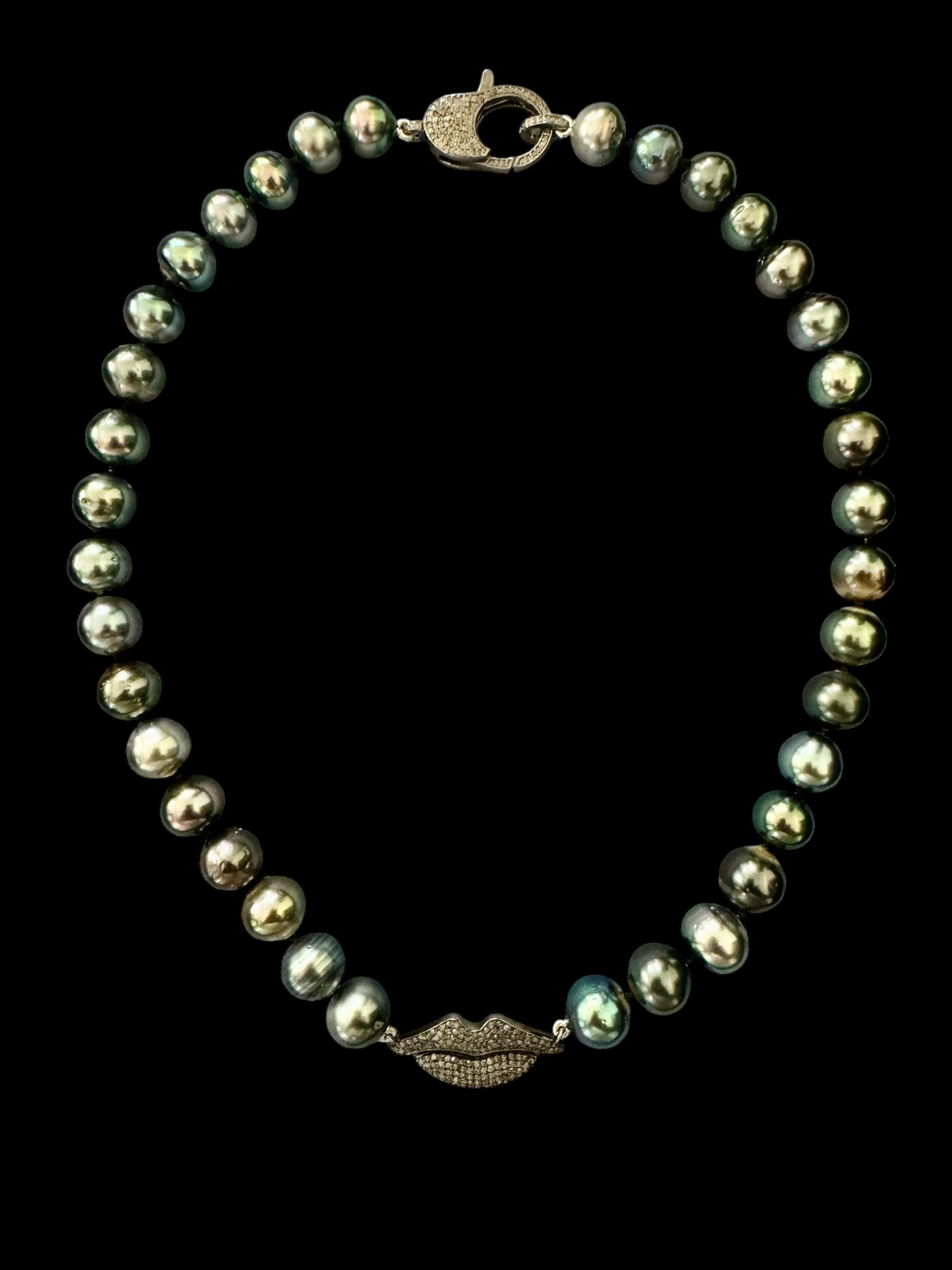 Kiss of Noir – Peacock Tahitian Pearl Necklace with Pavé Diamond Lips and Clasp