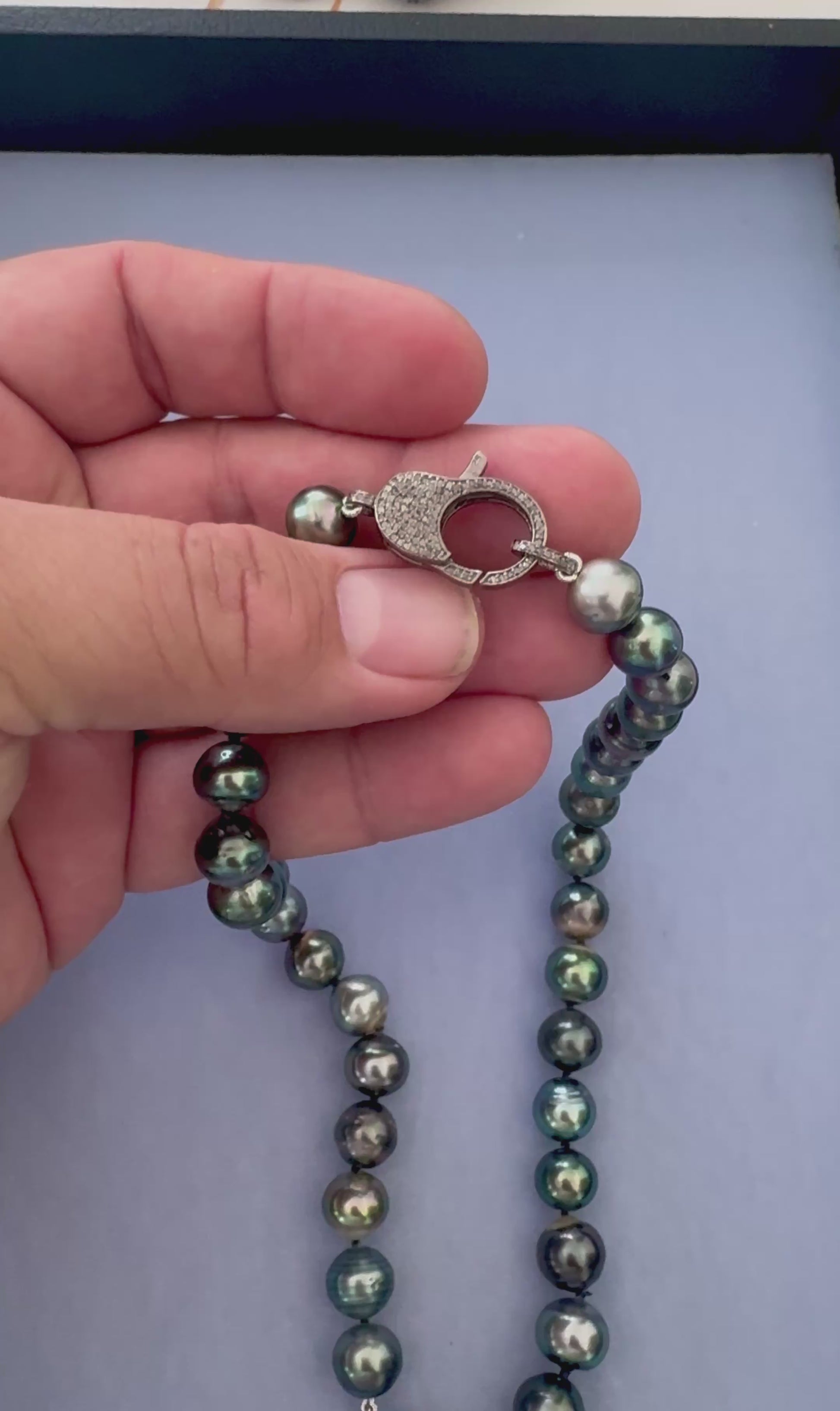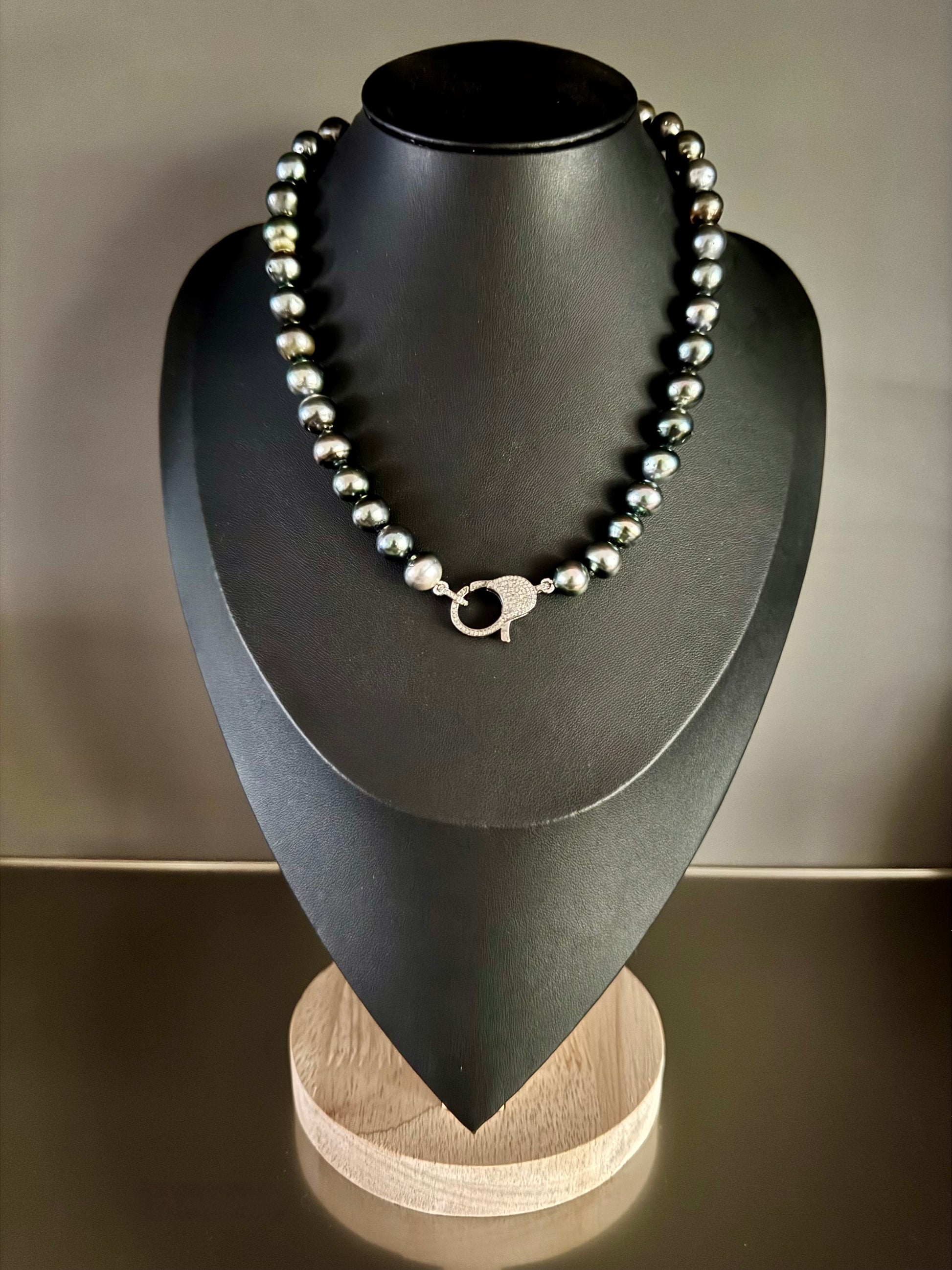 The Kiss of Noir necklace features 10–11mm peacock Tahitian pearls glowing with rich tones of green, aubergine, and midnight silver. Each pearl is hand-selected for its radiant luster and smooth, organic beauty—capturing the depth and allure of the sea.