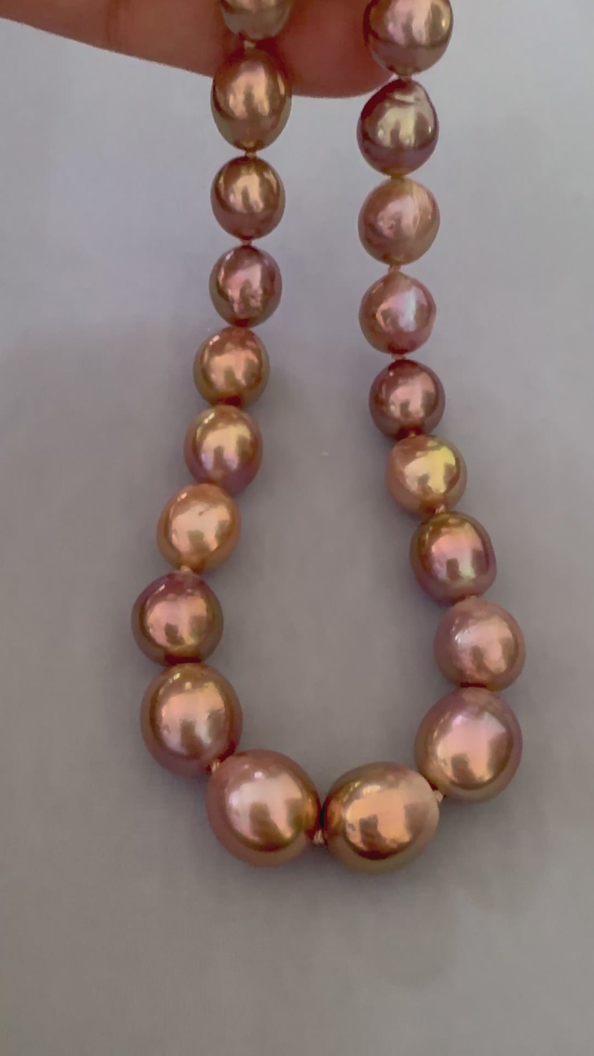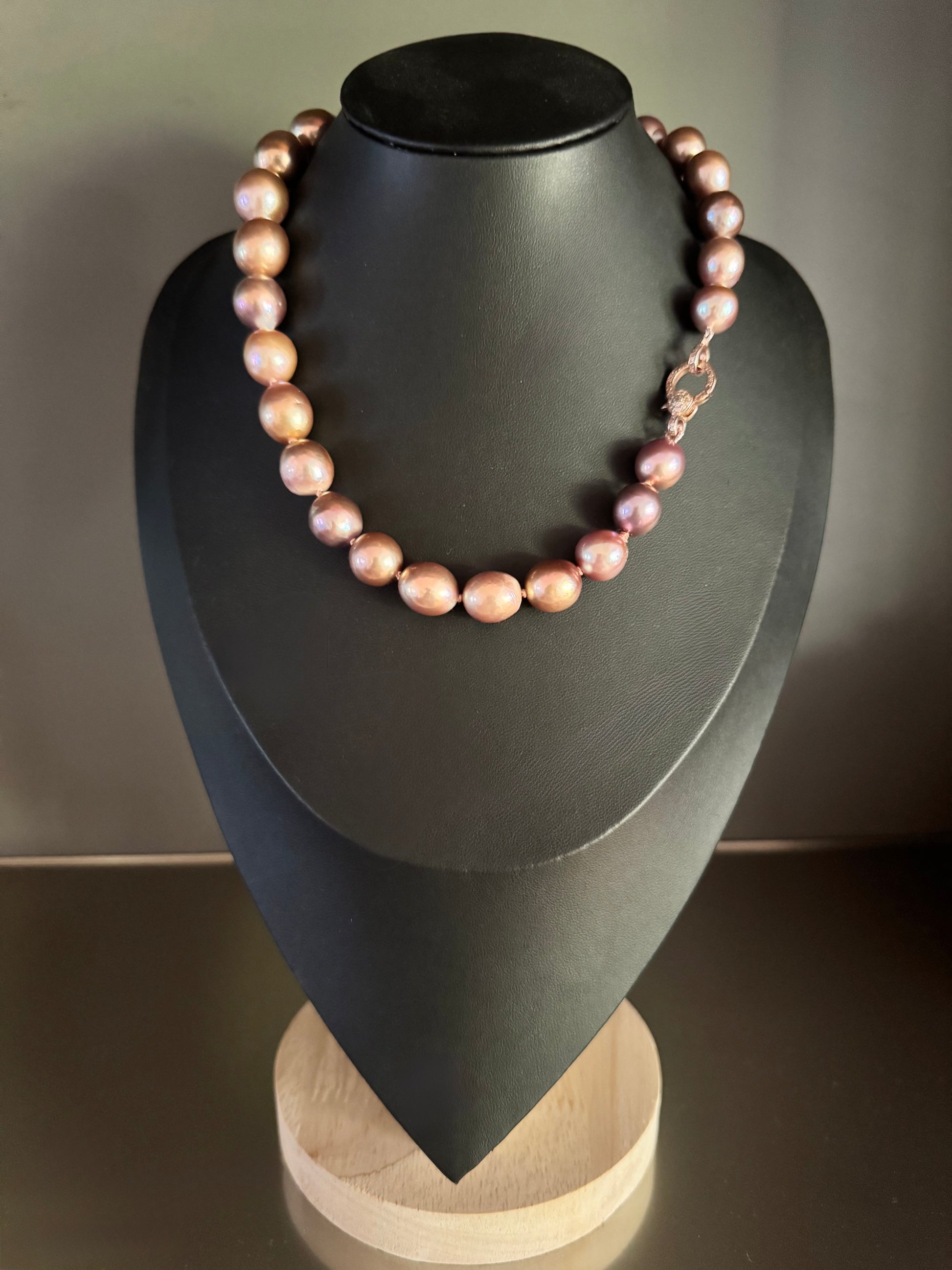 The strand is elegantly secured with a rose gold–plated sterling silver pavé diamond clasp, adding brilliance and warmth that perfectly complements the natural tones of the pearls. Bold yet refined, this necklace is designed to illuminate and elevate—effortlessly.
