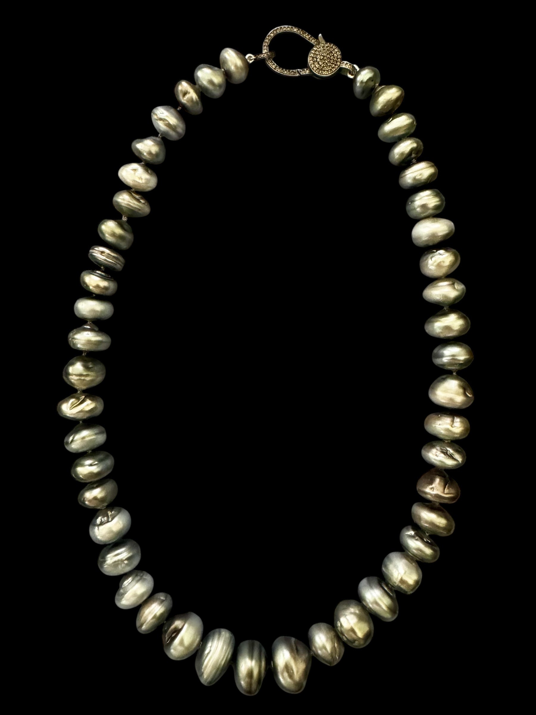 Strata – Rondelle Tahitian Silver Pearl Necklace with Pavé Diamond Oxidized Silver Clasp