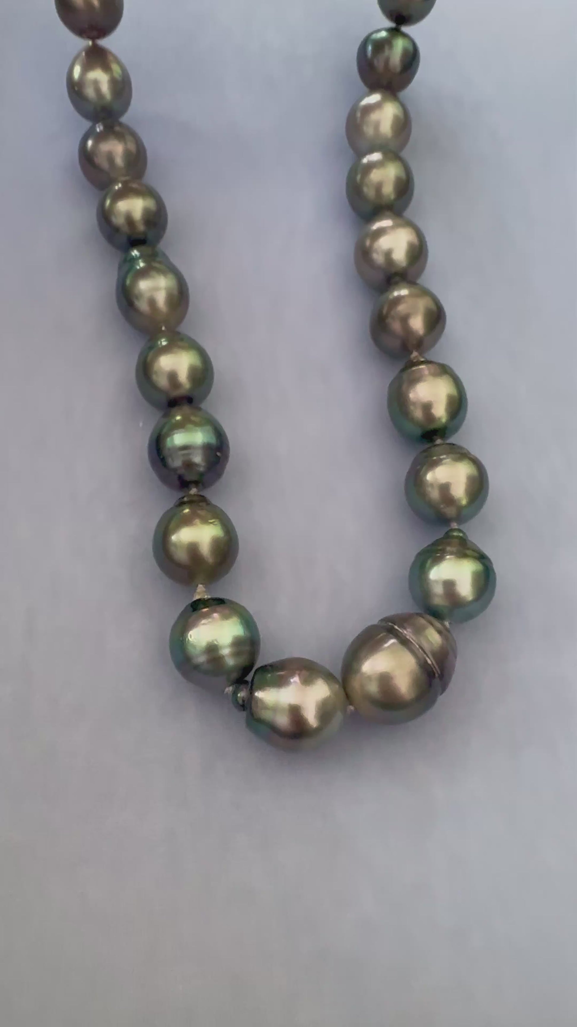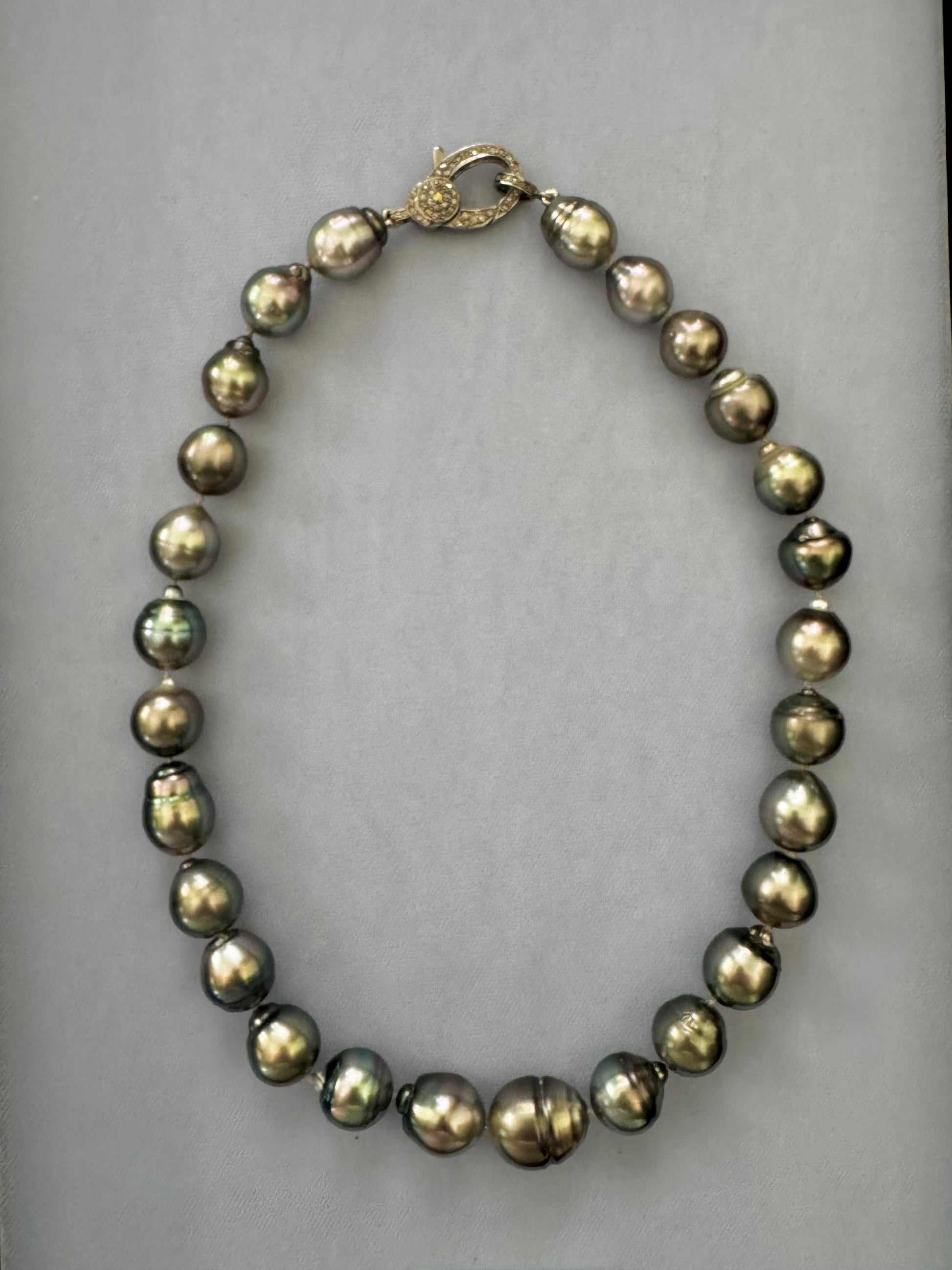 Deep, elegant, and endlessly captivating—Nocturne features 12–15mm Tahitian pearls with rich, natural tones of charcoal, silver, and peacock green. Their bold size and high luster give this strand a sculptural presence, while the subtle variation in color adds depth and dimension.