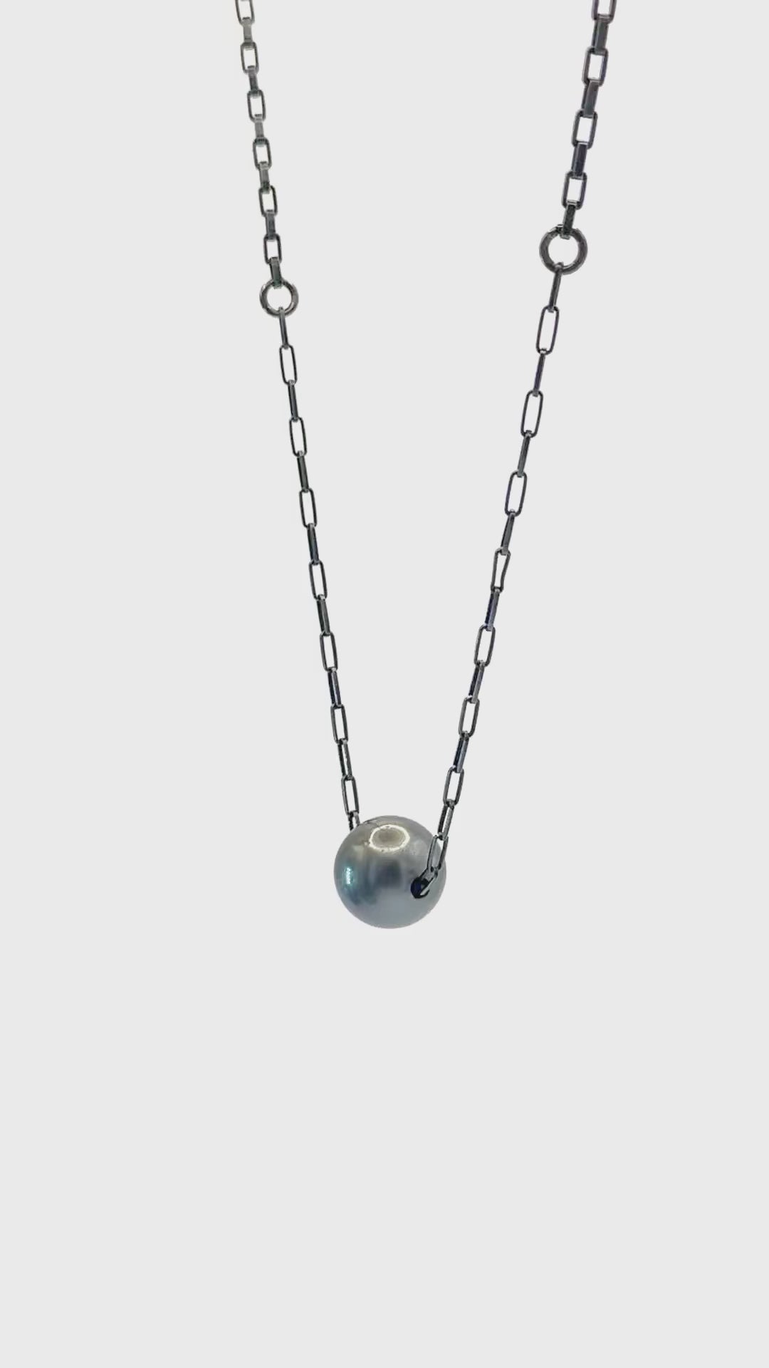 This 15.8mm Tahitian Pearl necklace features a unique combination of modern masculinity and classic elegance. The oxidized silver box chain adds a touch of edginess to the timeless beauty of the pearl. Elevate your style with this versatile and sophisticated piece.