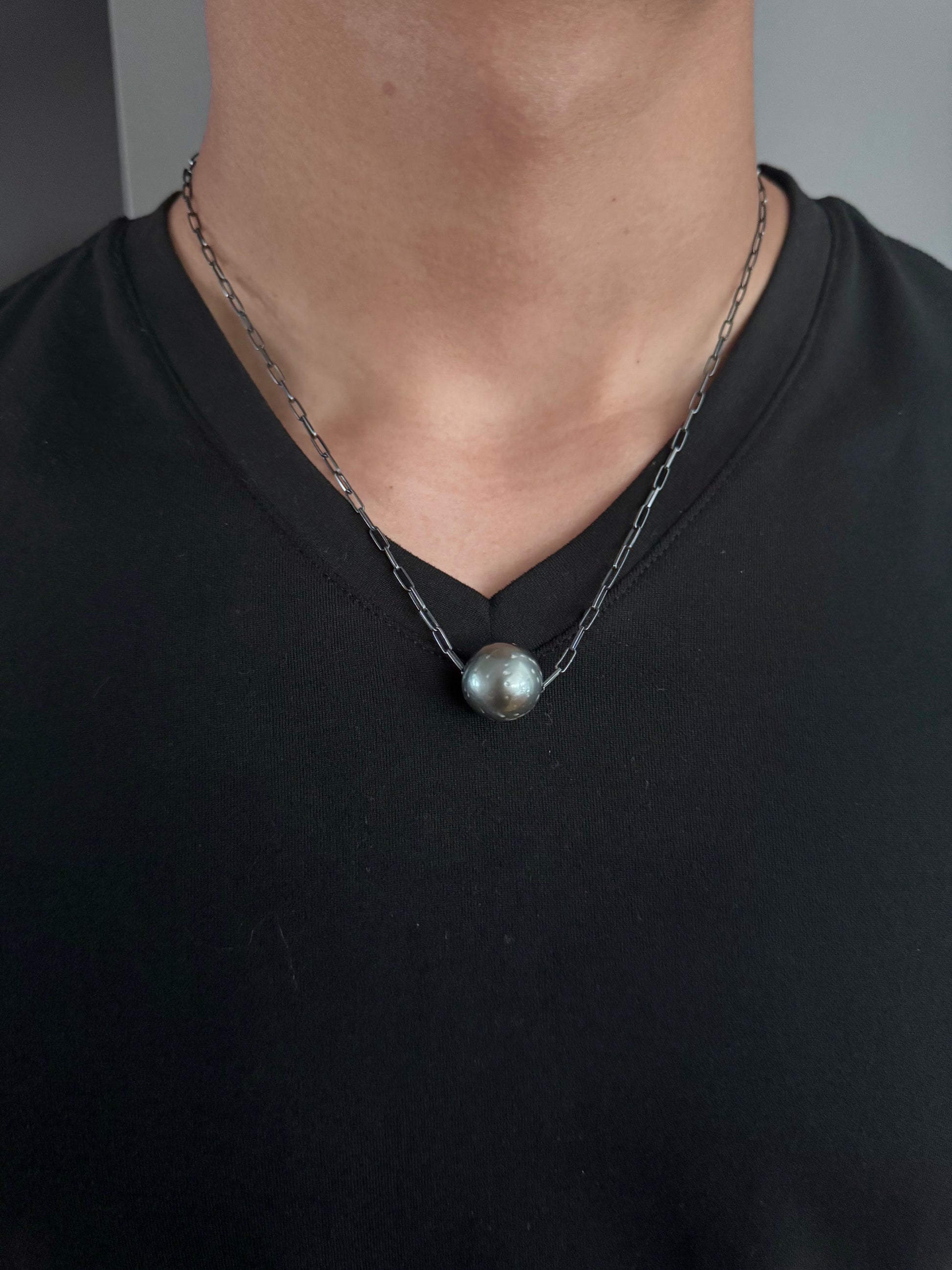 Elevate your style with our modern, masculine necklace featuring a stunning 16mm Tahitian pearl on oxidized silver. Make a statement without sacrificing elegance. Perfect for any occasion, this necklace exudes confidence and sophistication. Upgrade your accessory game with this bold and timeless piece.