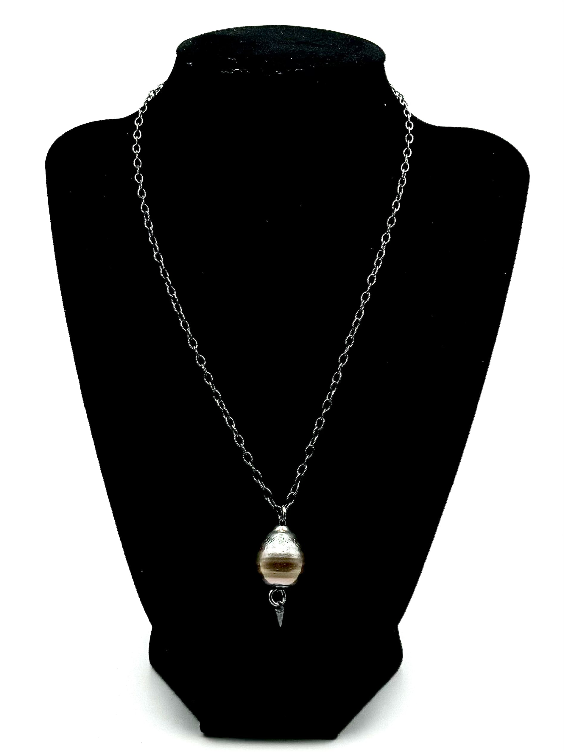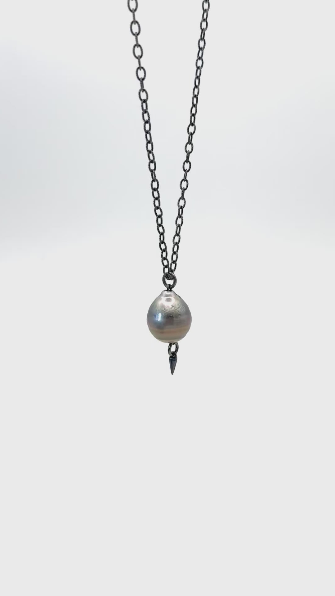 Introducing our stunning Tear Drop Tahitian Pearl Necklace, boasting a magnificent 19x16mm pearl. Suspended from a 5x3mm Black Rhodium Plated Sterling Silver Cable Chain measuring 18", adorned with an Oxidized Sterling Silver Spike Pendant.