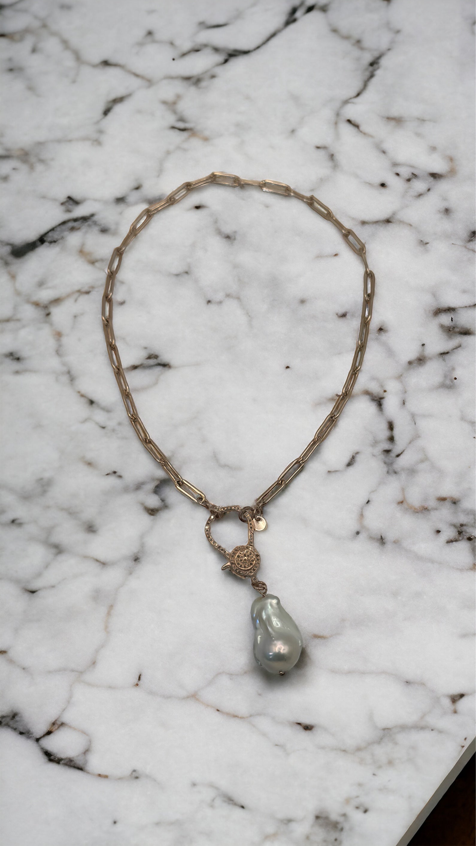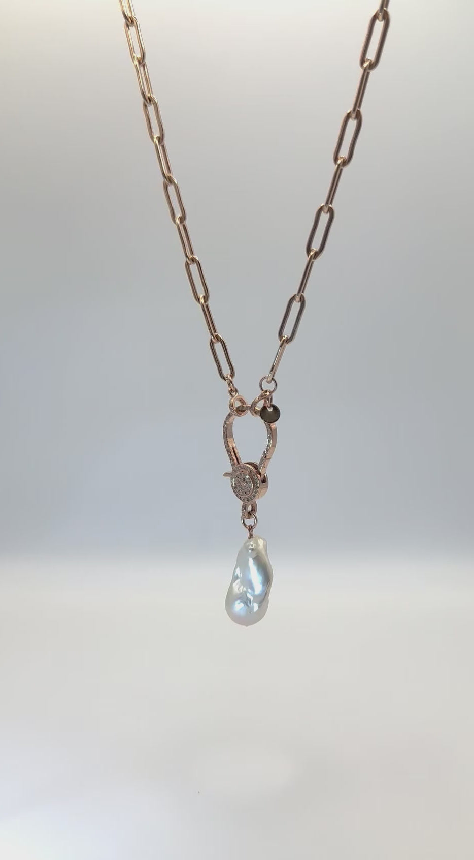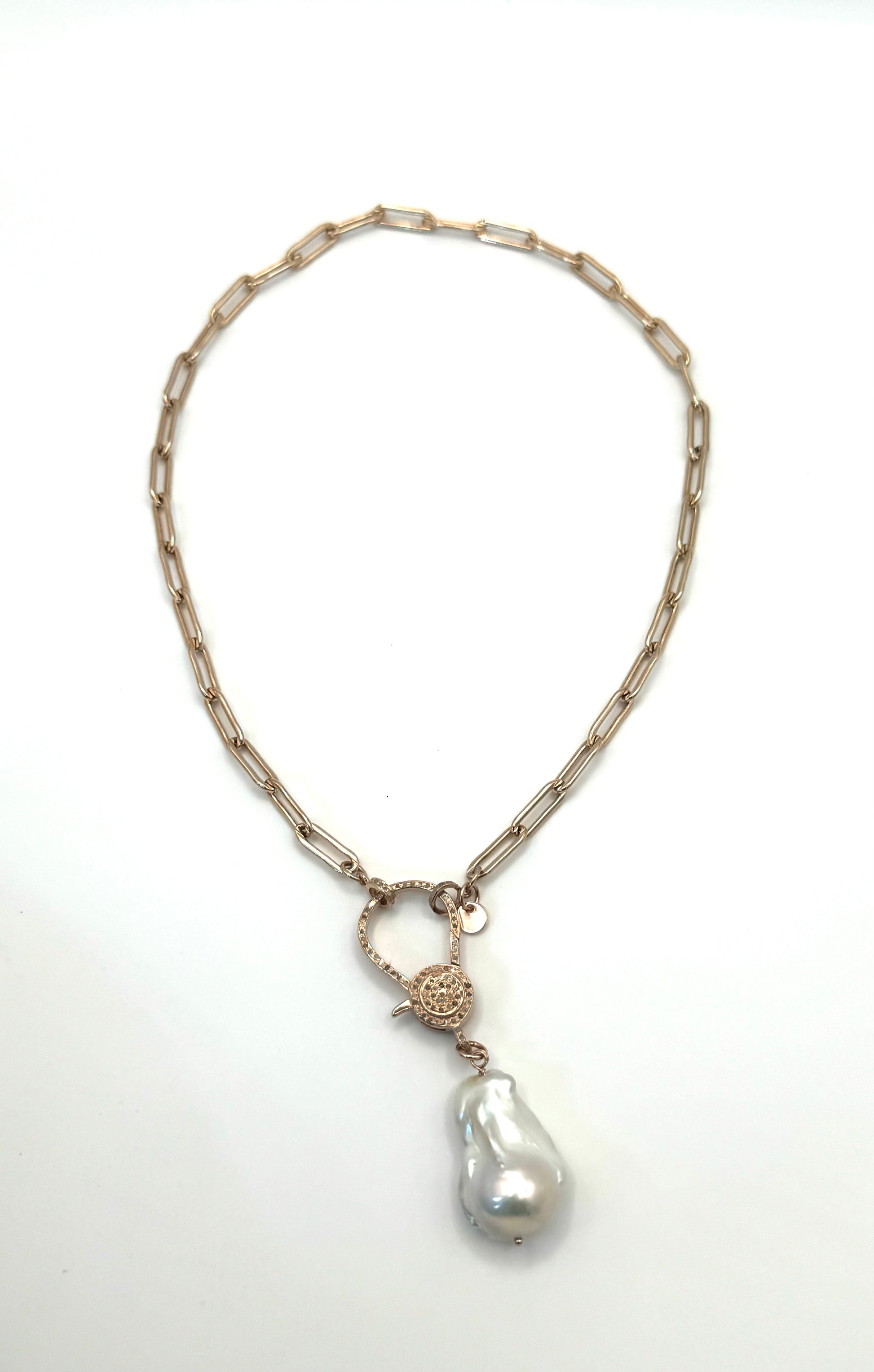 Indulge in luxury with our 29x19mm Baroque White Freshwater Pearl Necklace. The large, unique baroque pearl, accompanied by a stunning rose gold diamond clasp, exudes elegance and opulence. Elevate any look with this exclusive, sophisticated piece.