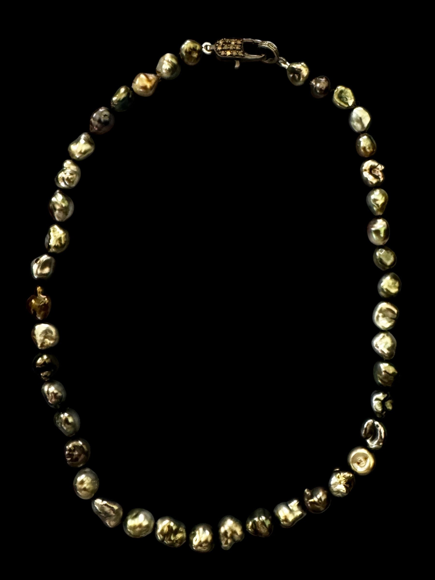 Ocean Whisper – Tahitian Keshi Pearl Necklace with Oxidized Silver Diamond Clasp