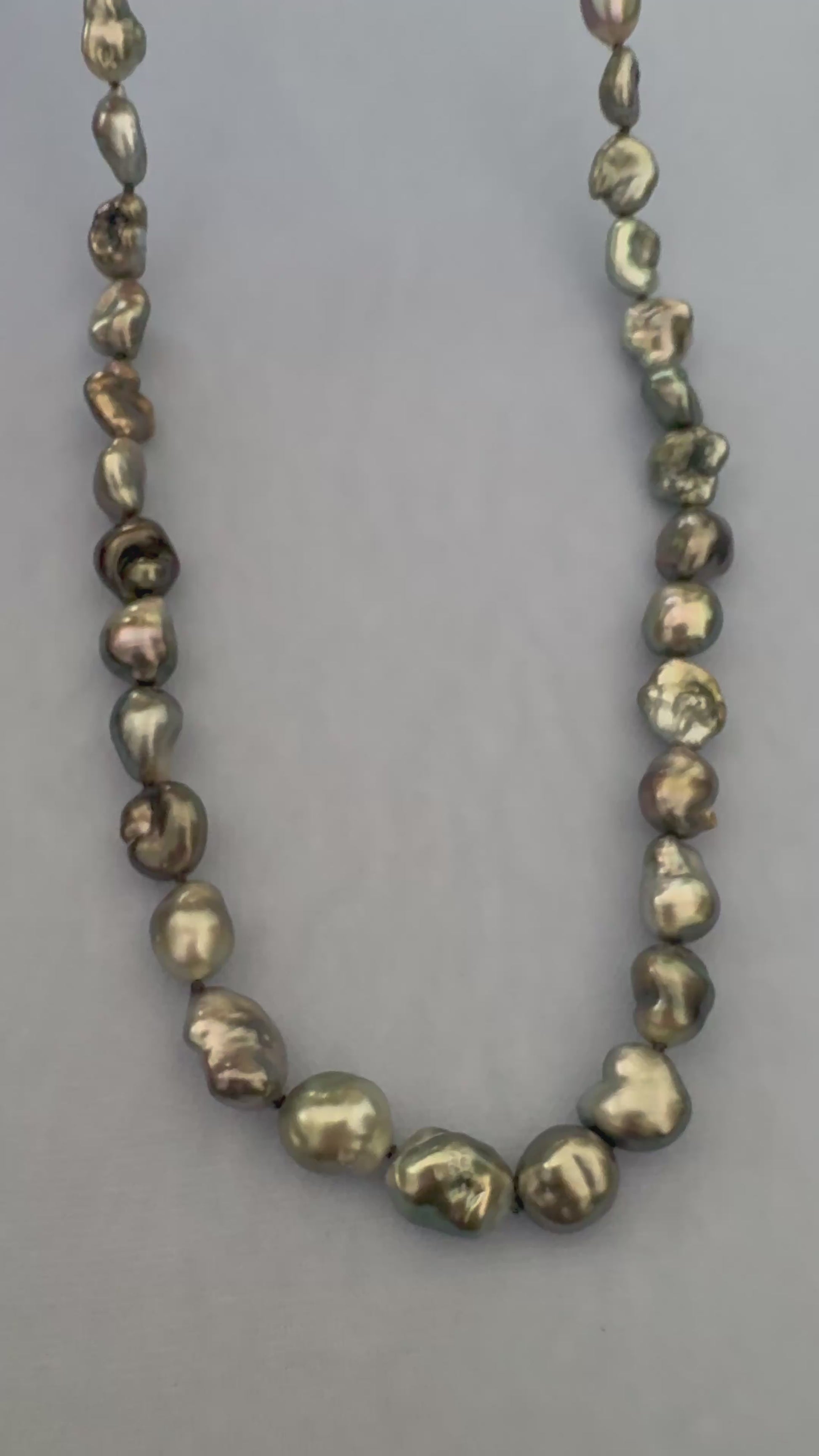 Delicate, fluid, and undeniably captivating — the Ocean Whisper necklace features a strand of 8–9mm Tahitian Keshi pearls, celebrated for their organic shapes, radiant luster, and natural iridescence. Each pearl is a unique sculptural form, reflecting soft tones of silver, slate, and ocean green with a metallic sheen that dances in the light.