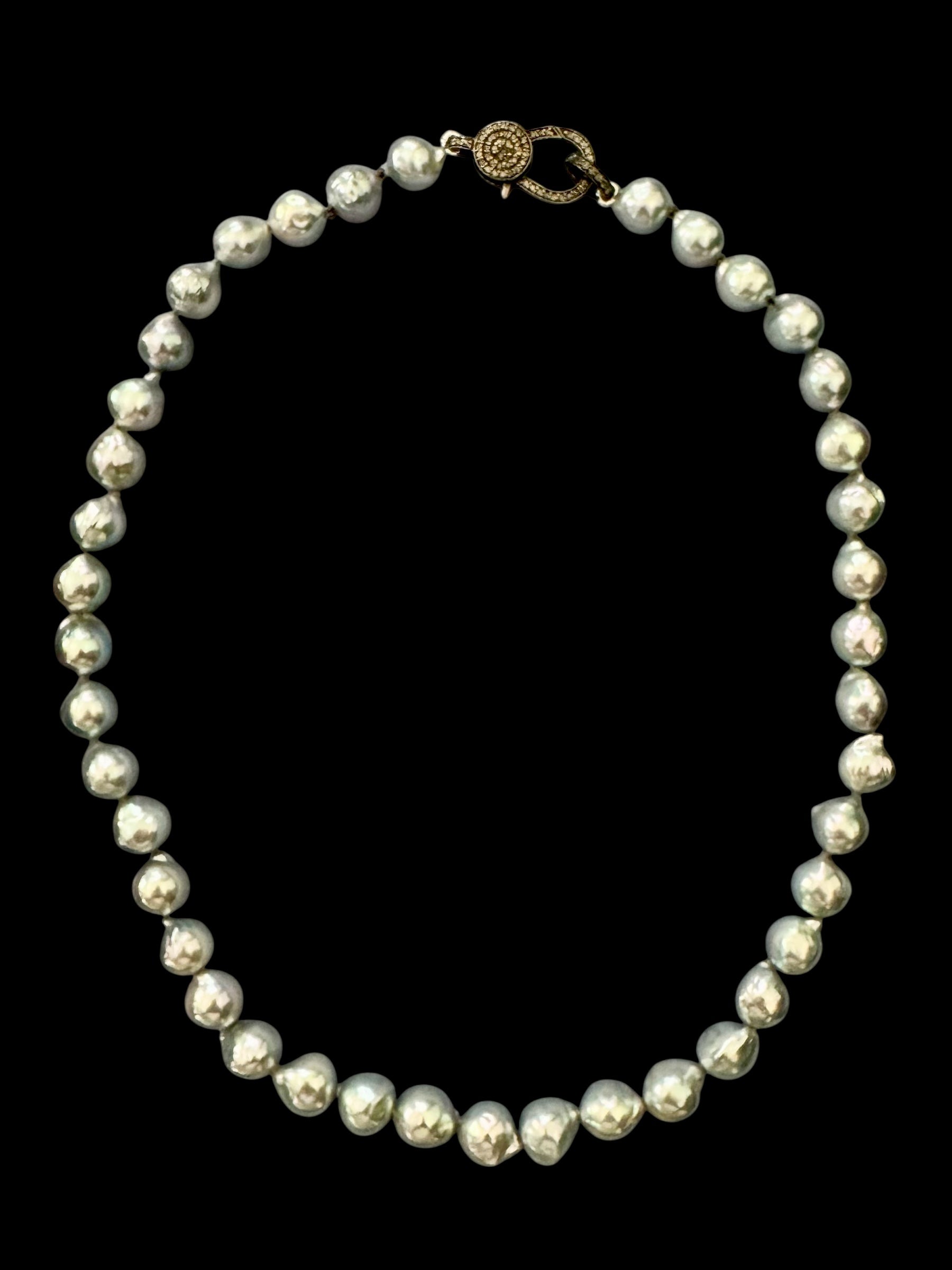 Elegant with an edge, the Ocean Noir necklace features 9–9.5mm blue Akoya pearls—each one shimmering with silver-blue tones and a satiny, mirror-like luster. These rare cultured pearls evoke the cool depths of the sea, balanced by the bold presence of an oxidized silver pavé diamond clasp that adds a touch of dark sparkle.