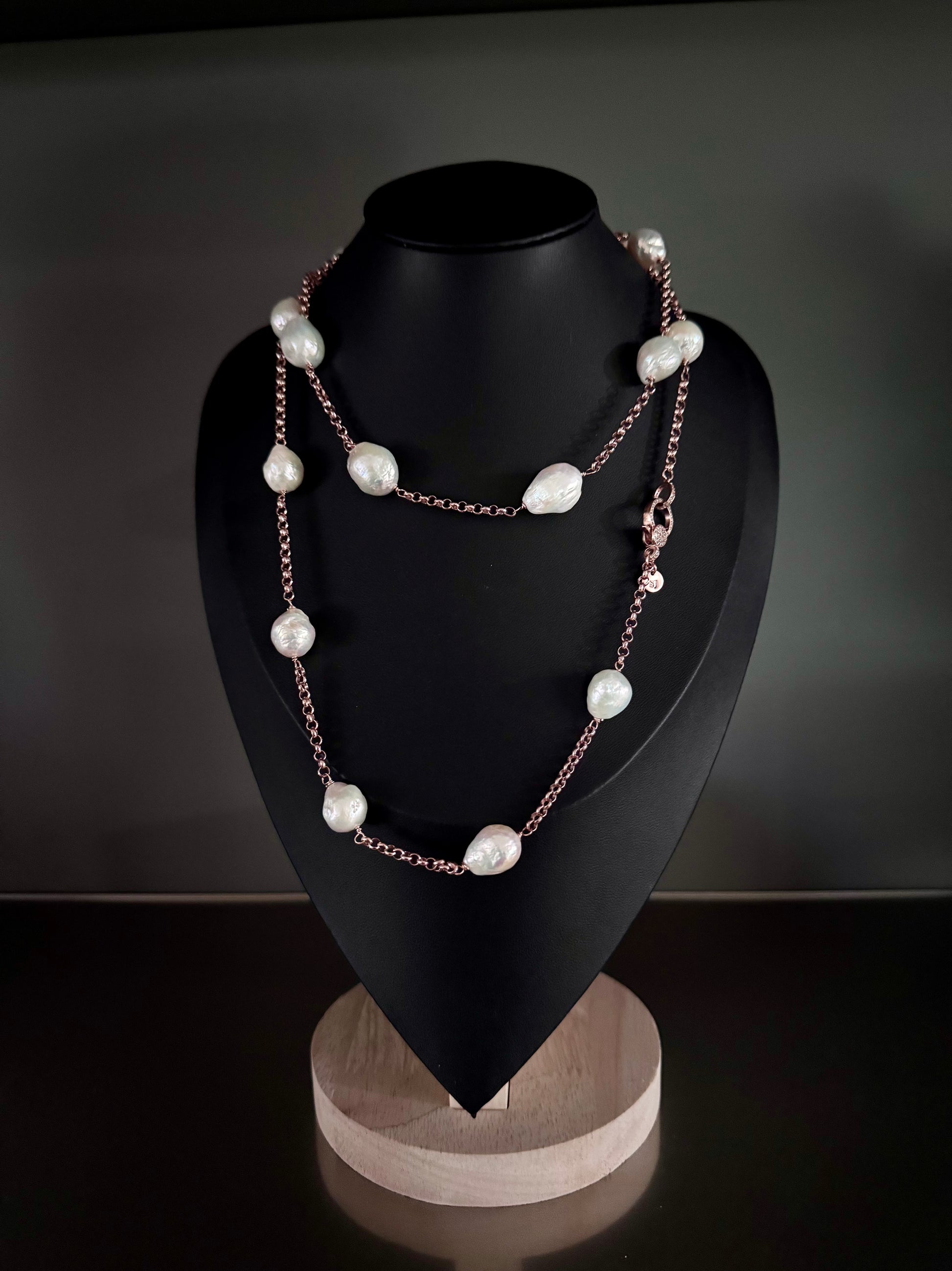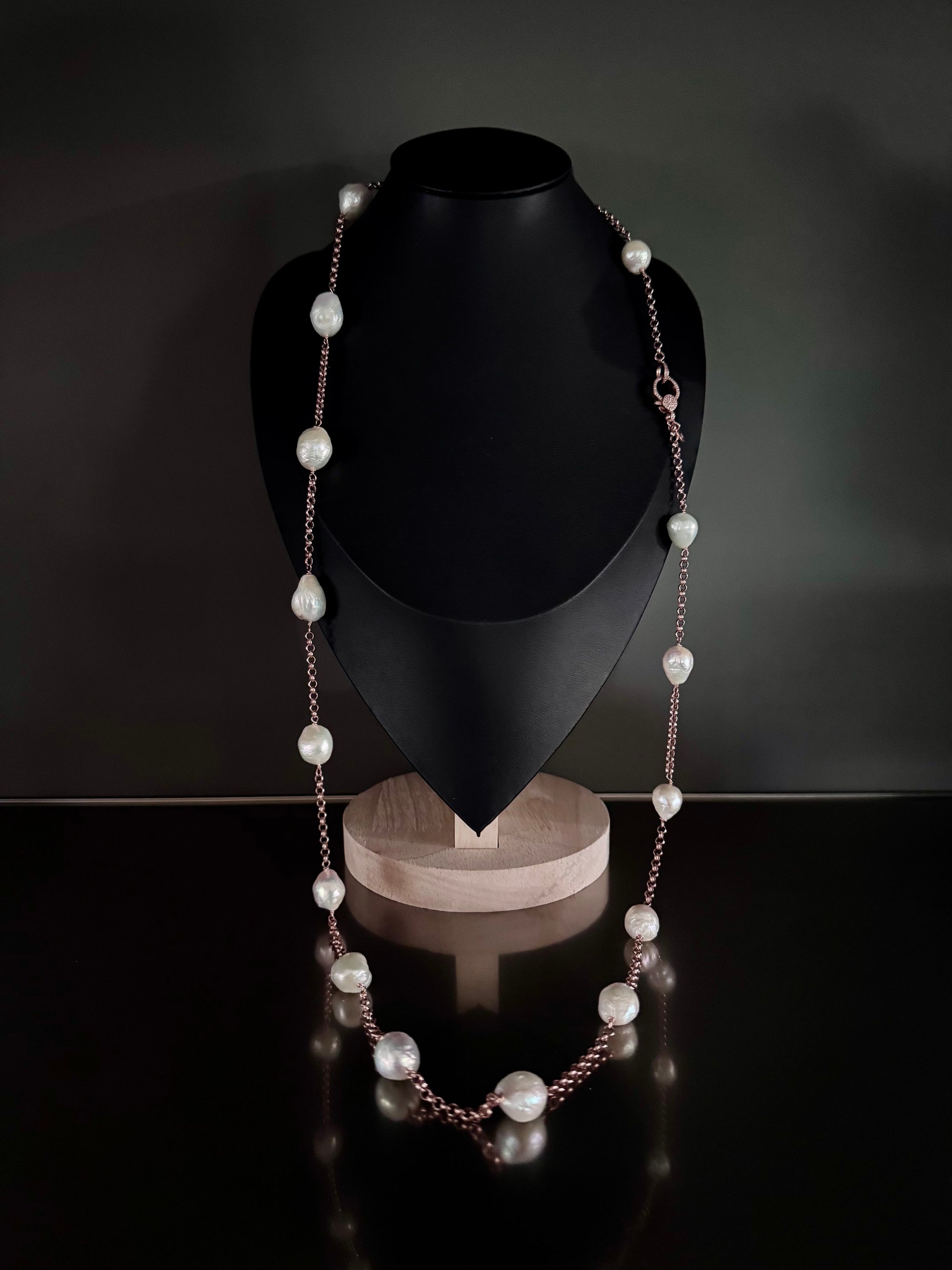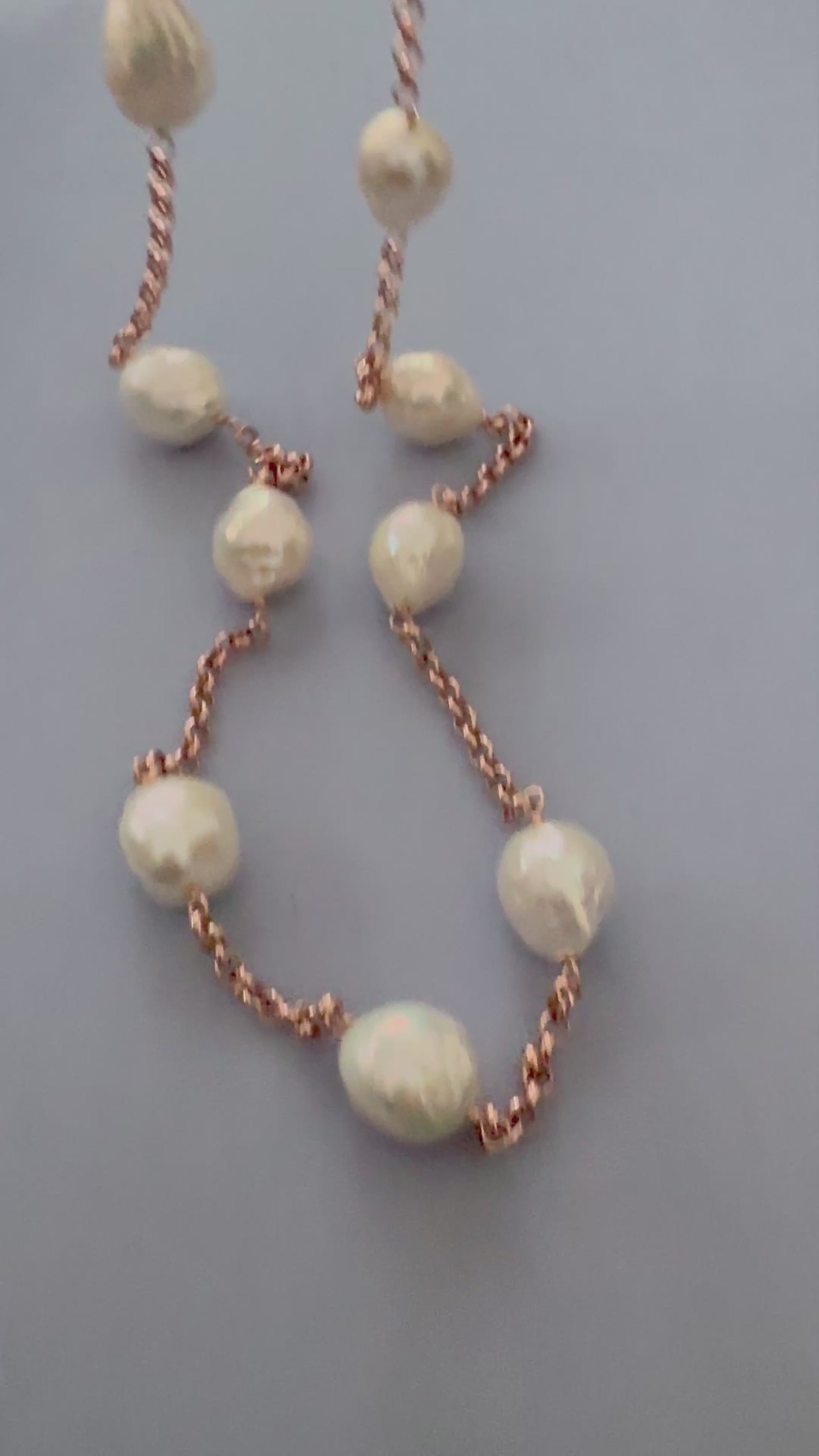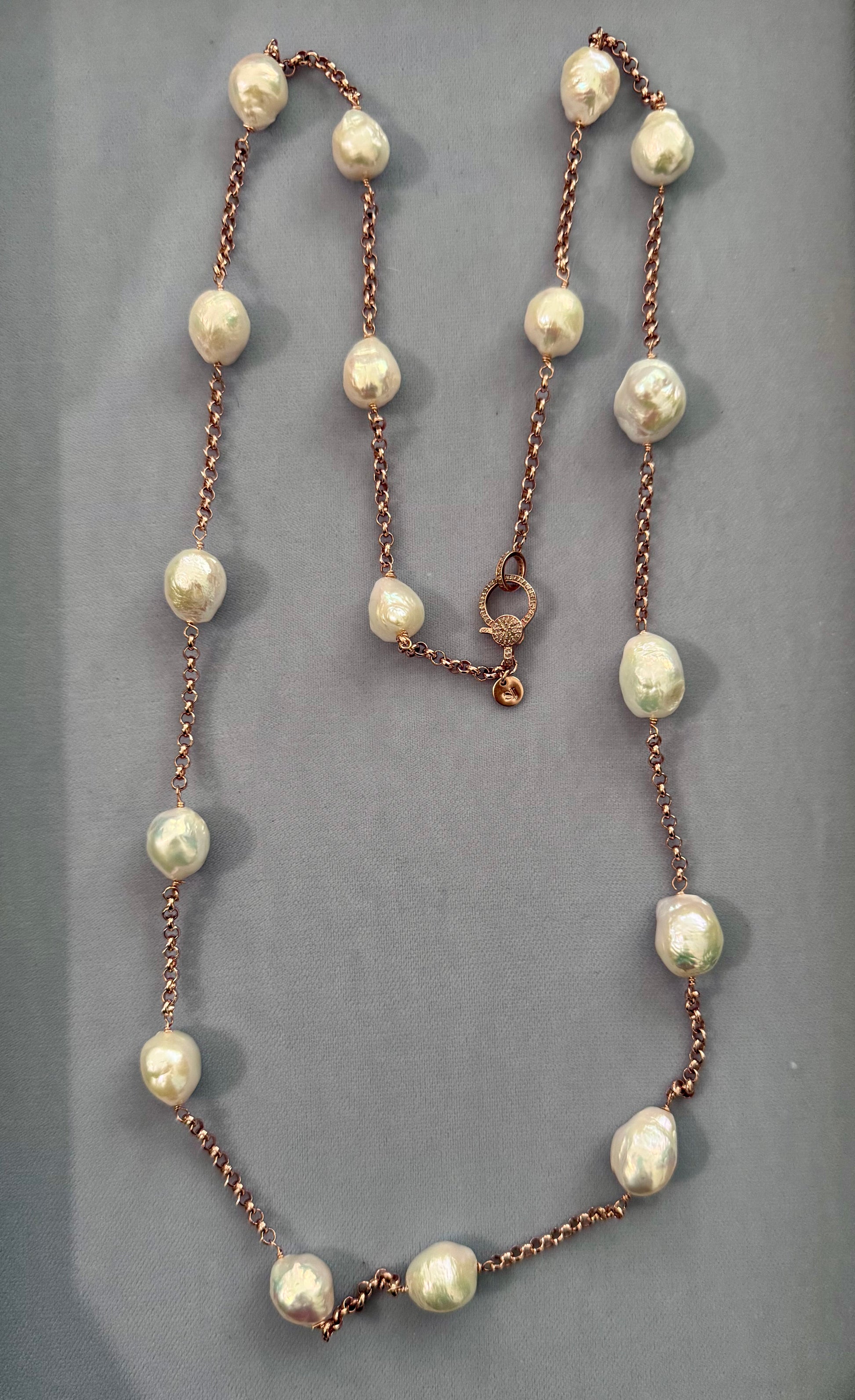 Radiating timeless elegance with a modern twist, the Aurora Grace necklace features luminous 12–15mm White Aurora Baroque Edison pearls, celebrated for their rippled surfaces and ethereal rainbow overtones. These rare pearls are linked along a refined rose gold vermeil rolo chain in a long station design, offering versatile styling for layering or wearing solo. A rose gold vermeil pavé diamond clasp completes the look, adding a touch of sparkle that elevates the necklace from beautiful to breathtaking.