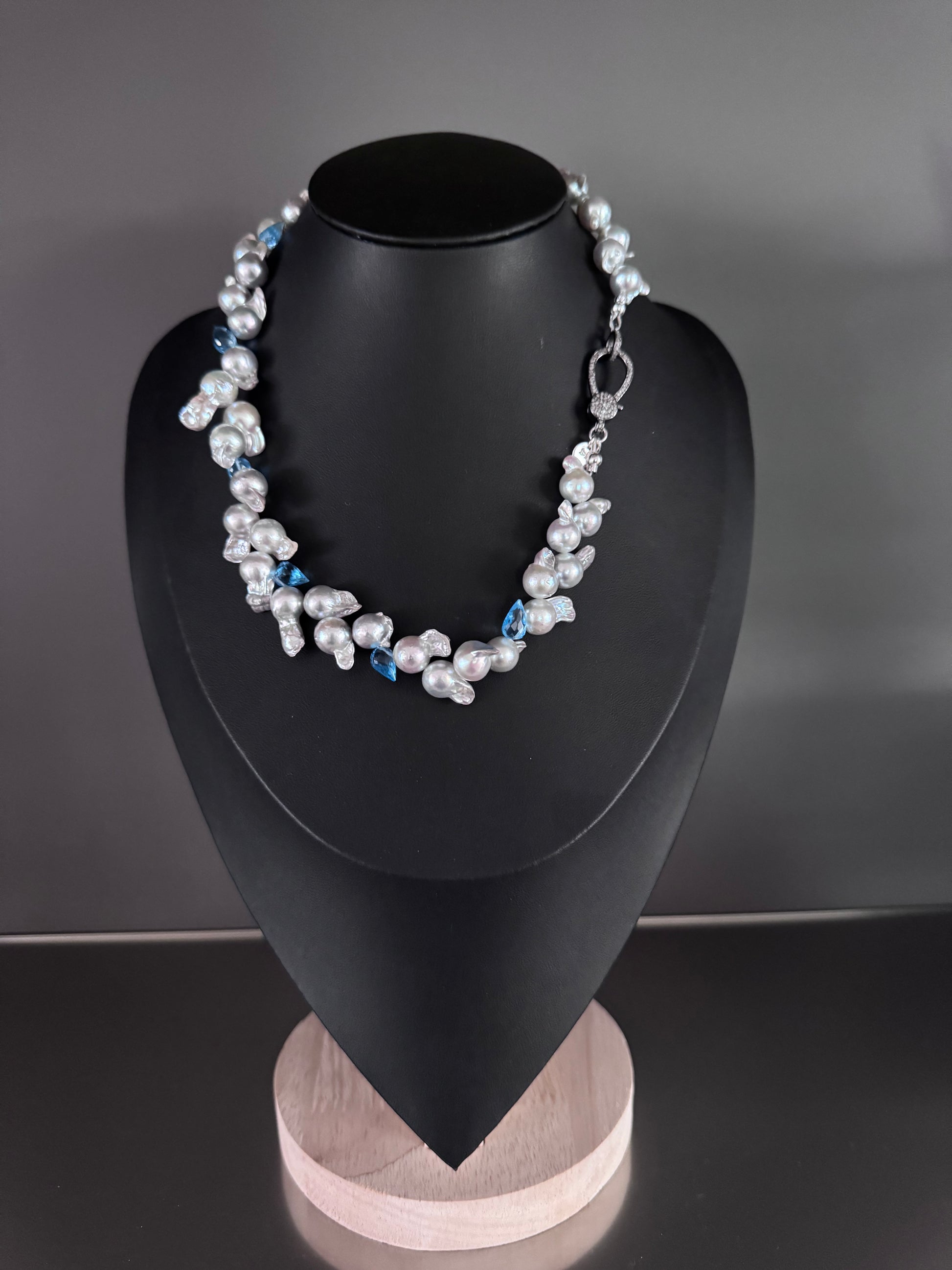 A striking composition of shimmer and hue, the Blue Cascade necklace features luminous 9–10mm baroque blue Akoya pearls interspersed with vibrant 8mm faceted blue topaz accents. The unique, organic shape of each pearl reflects the light with soft iridescence, while the topaz drops infuse a refreshing brilliance that evokes cascading water. Finished with an oxidized silver pavé diamond clasp for a dramatic touch of sparkle, this piece is a statement in fluid elegance and modern craftsmanship.