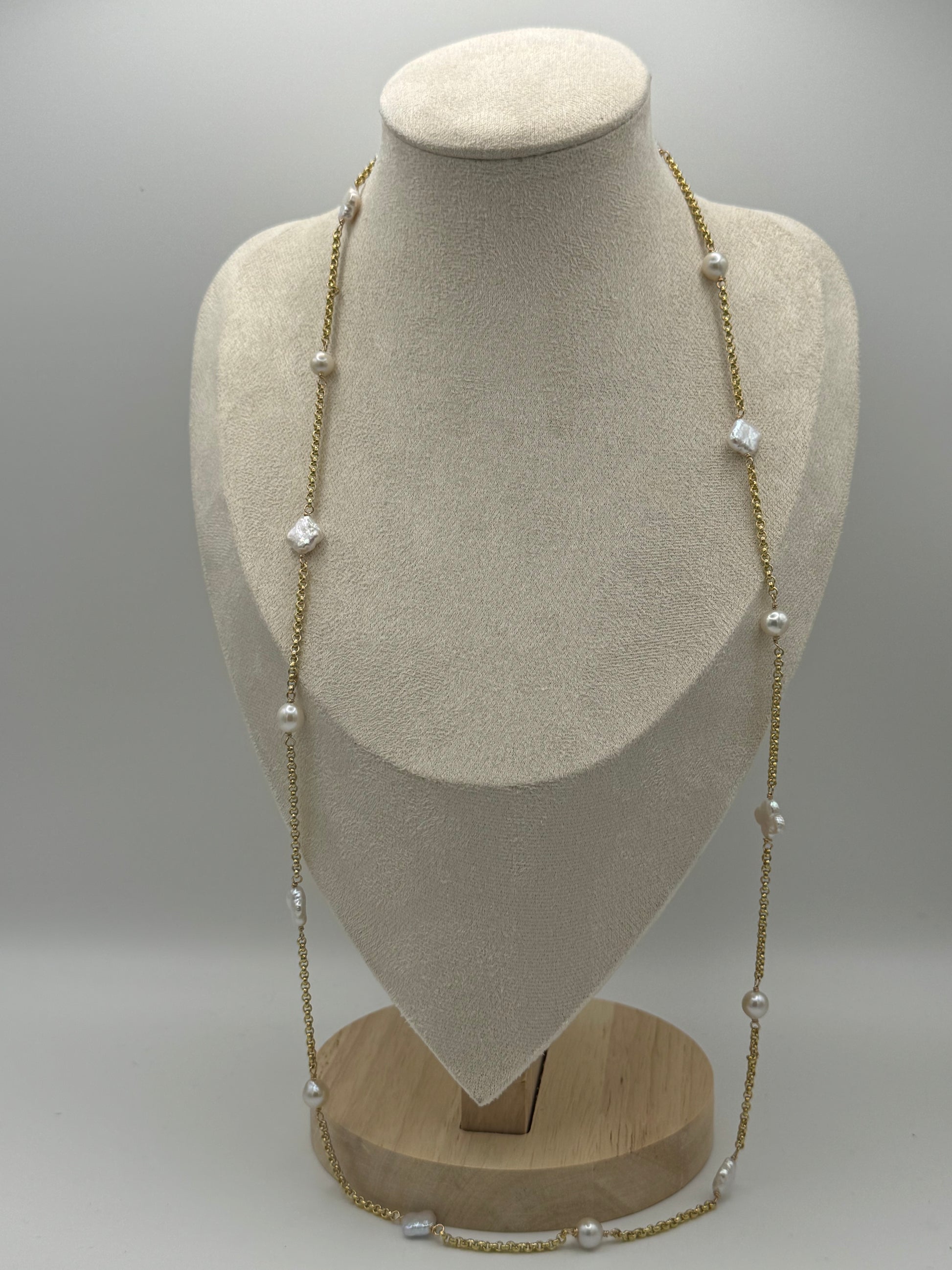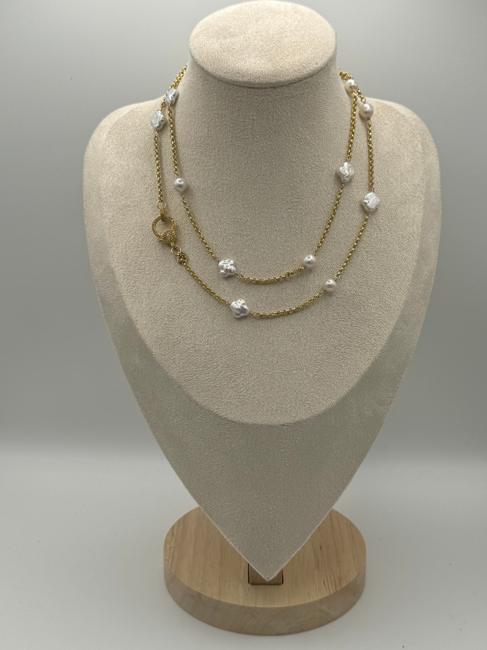 The Golden Clover Station Necklace is a refined statement piece blending timeless pearls with modern versatility. Handcrafted with 7–8mm freshwater Akoya pearls and luminous 8mm white clover-shaped pearls, each gem is delicately stationed along a gold-plated sterling silver rolo chain. A gold-plated silver pavé diamond clasp completes the design, adding brilliance and sophistication. Measuring 32” in length, this necklace offers the flexibility to be worn long for a sleek silhouette or doubled for a bold layered look.