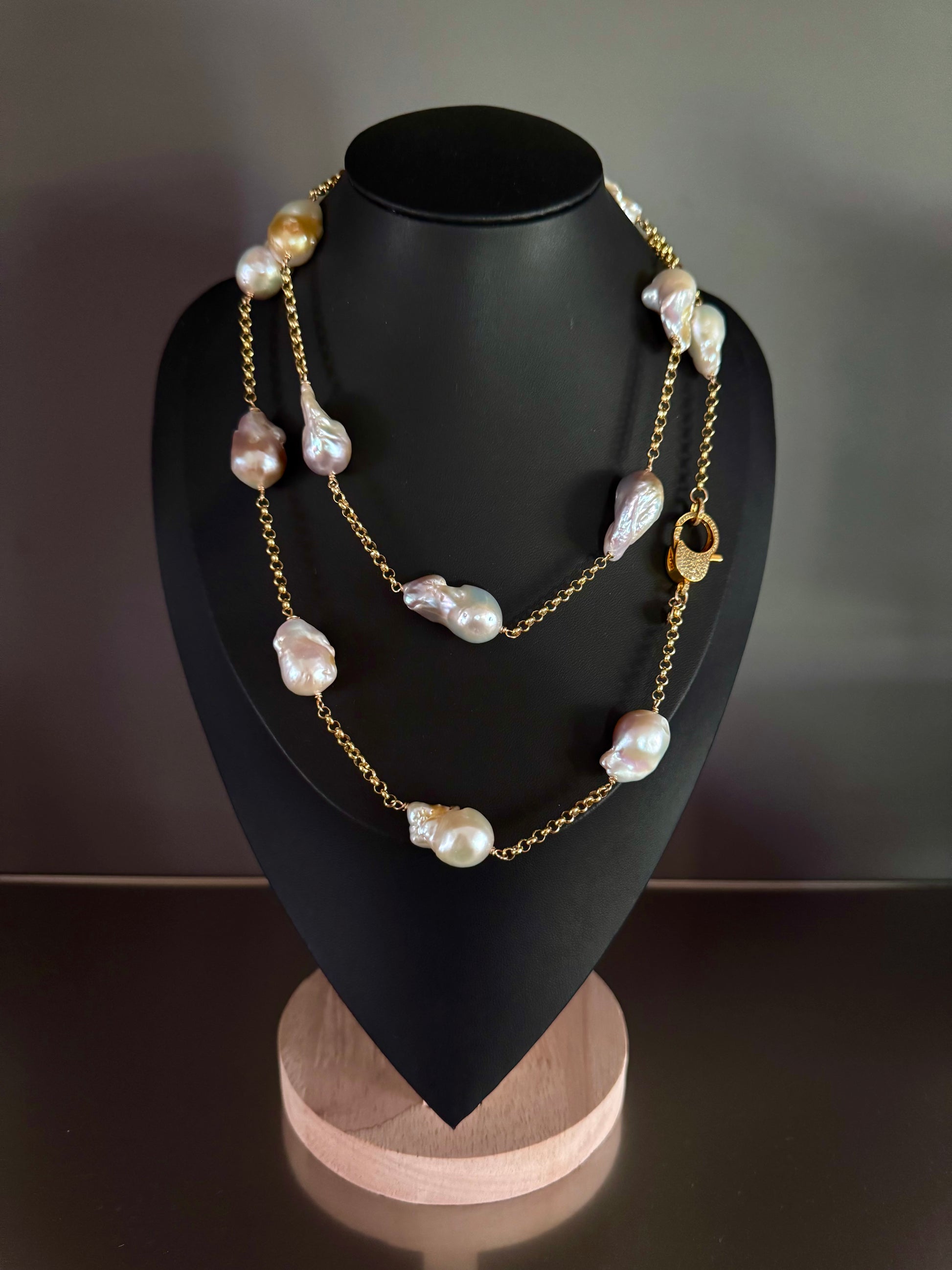 The Golden Halo necklace radiates warmth and sophistication, featuring 14–16mm white baroque pearls with an exceptional golden luster. Each luminous pearl is stationed along a sleek gold vermeil rolo chain, creating a harmonious rhythm of texture and shine. The design is completed with a pavé diamond clasp in matching gold vermeil, adding a touch of brilliance to its golden glow. Modern yet timeless, this necklace is a statement of elegance for any occasion.