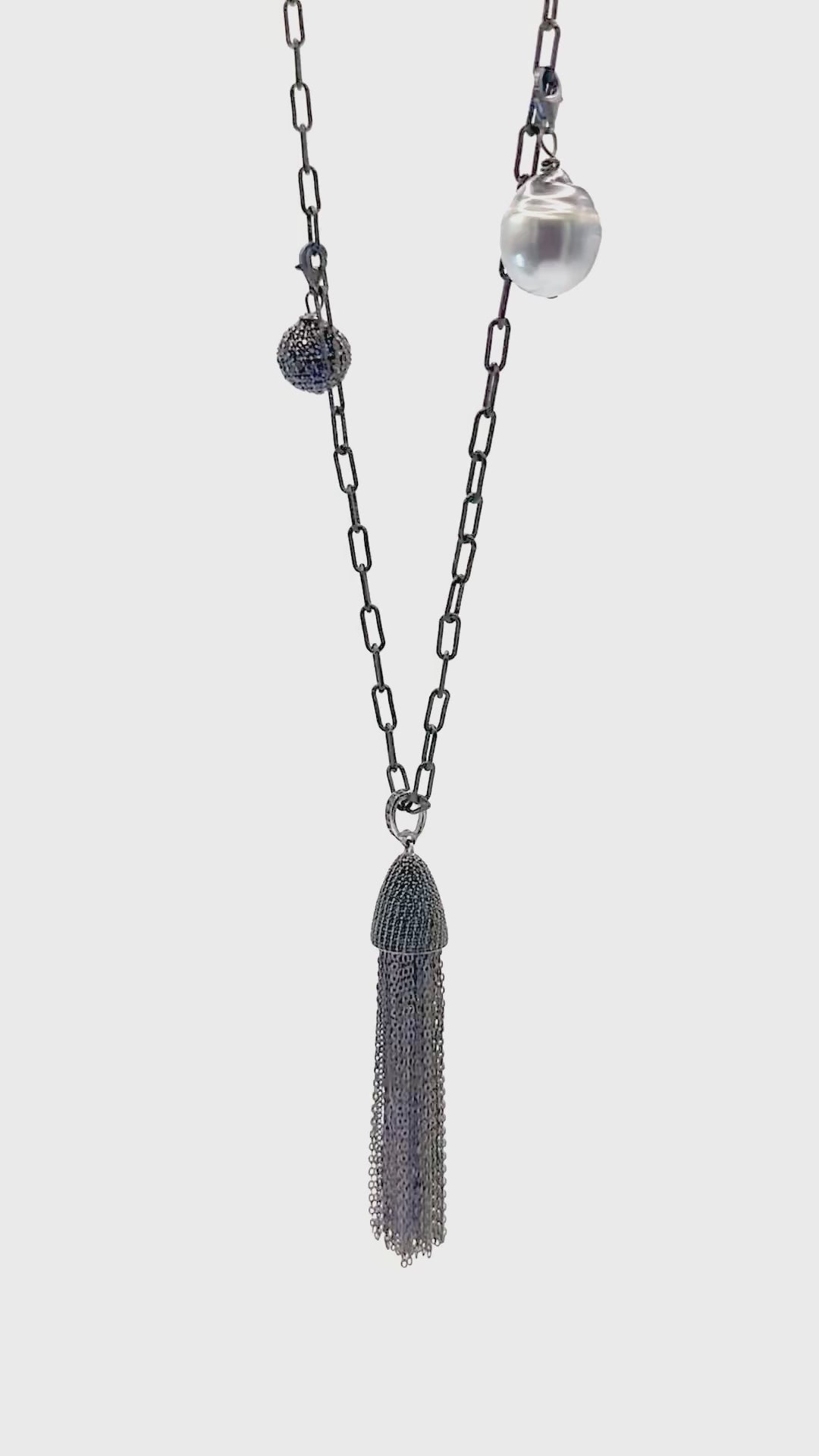 Elevate your style with our Grey Tahitian Pearl and Black Spinel Tassel Necklace. This modern piece combines the sophistication of grey Tahitian pearls with the edgy sparkle of black spinel. Make a statement and add a touch of glamour to any outfit. Perfect for the fashion-forward and stylish individual.