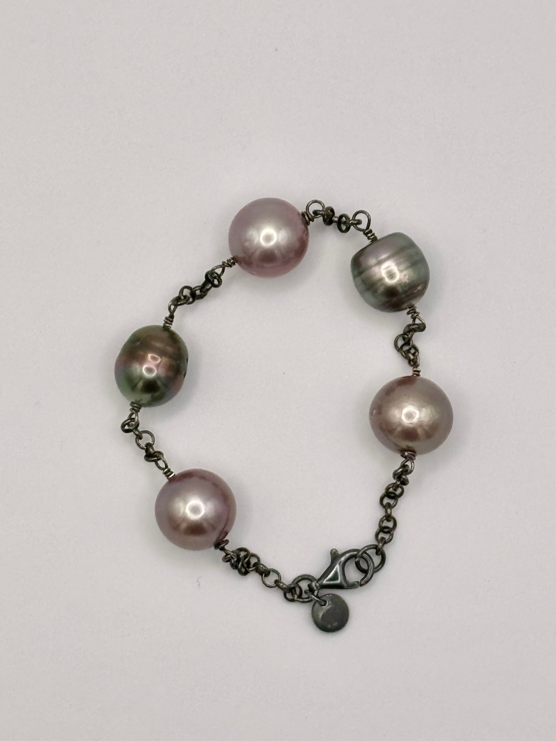 Grey Tahitian Pearl and Pink Edison Pearl Oxidized Silver Station Bracelet