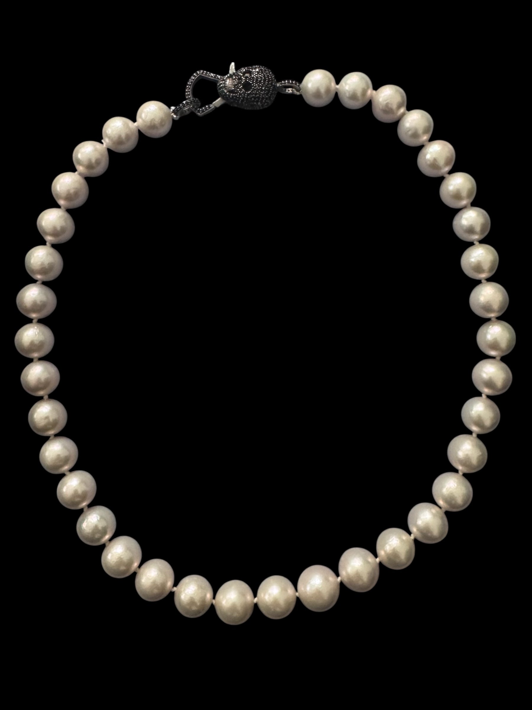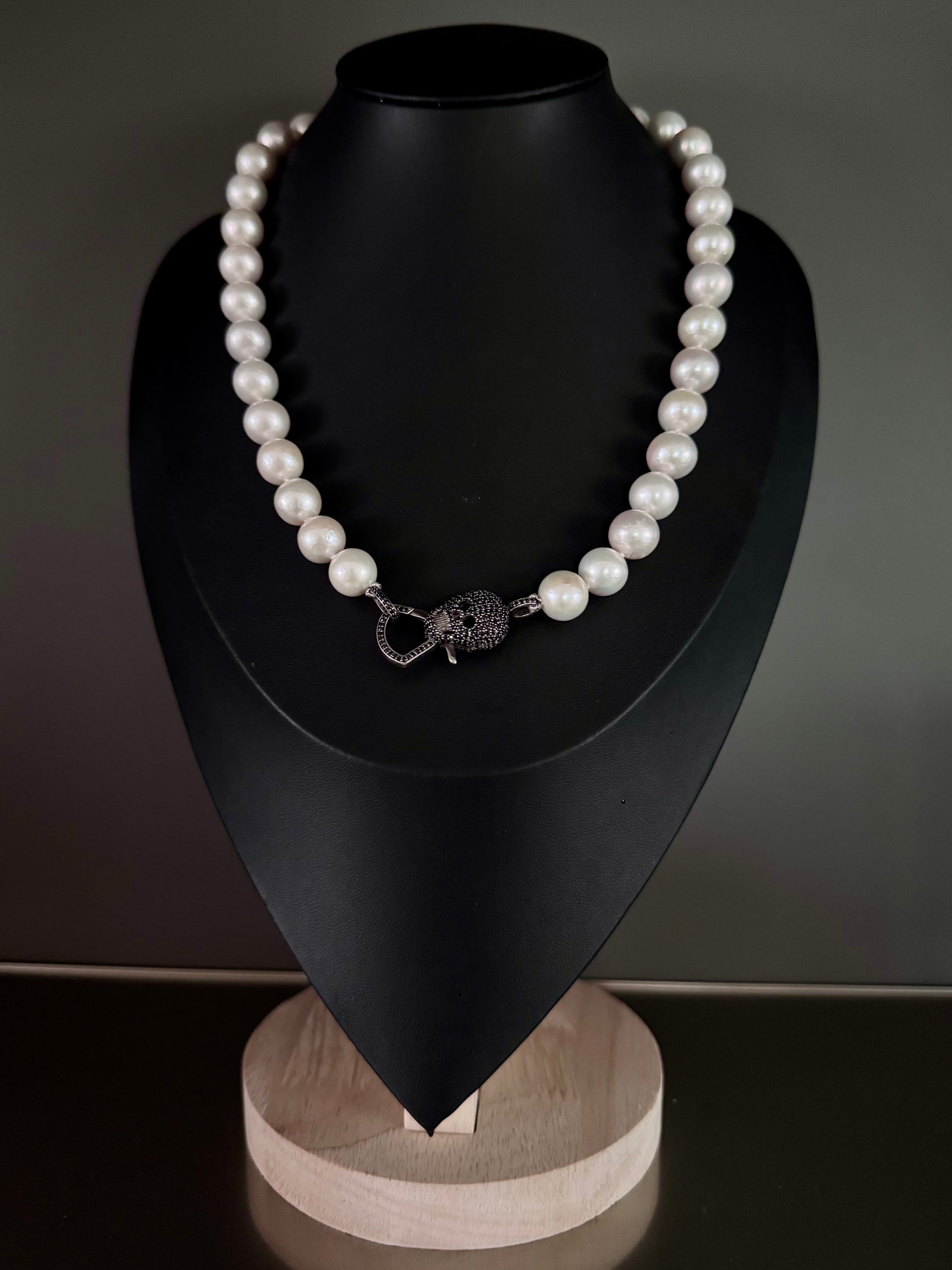 Elevate your look with a necklace that shifts with your mood. The Luminous Edge pairs radiant 11–13mm white Edison pearls with a dramatic pavé black spinel skull clasp in oxidized sterling silver. Each pearl is hand-selected for its soft luster and natural elegance—offering timeless beauty with a bold twist.