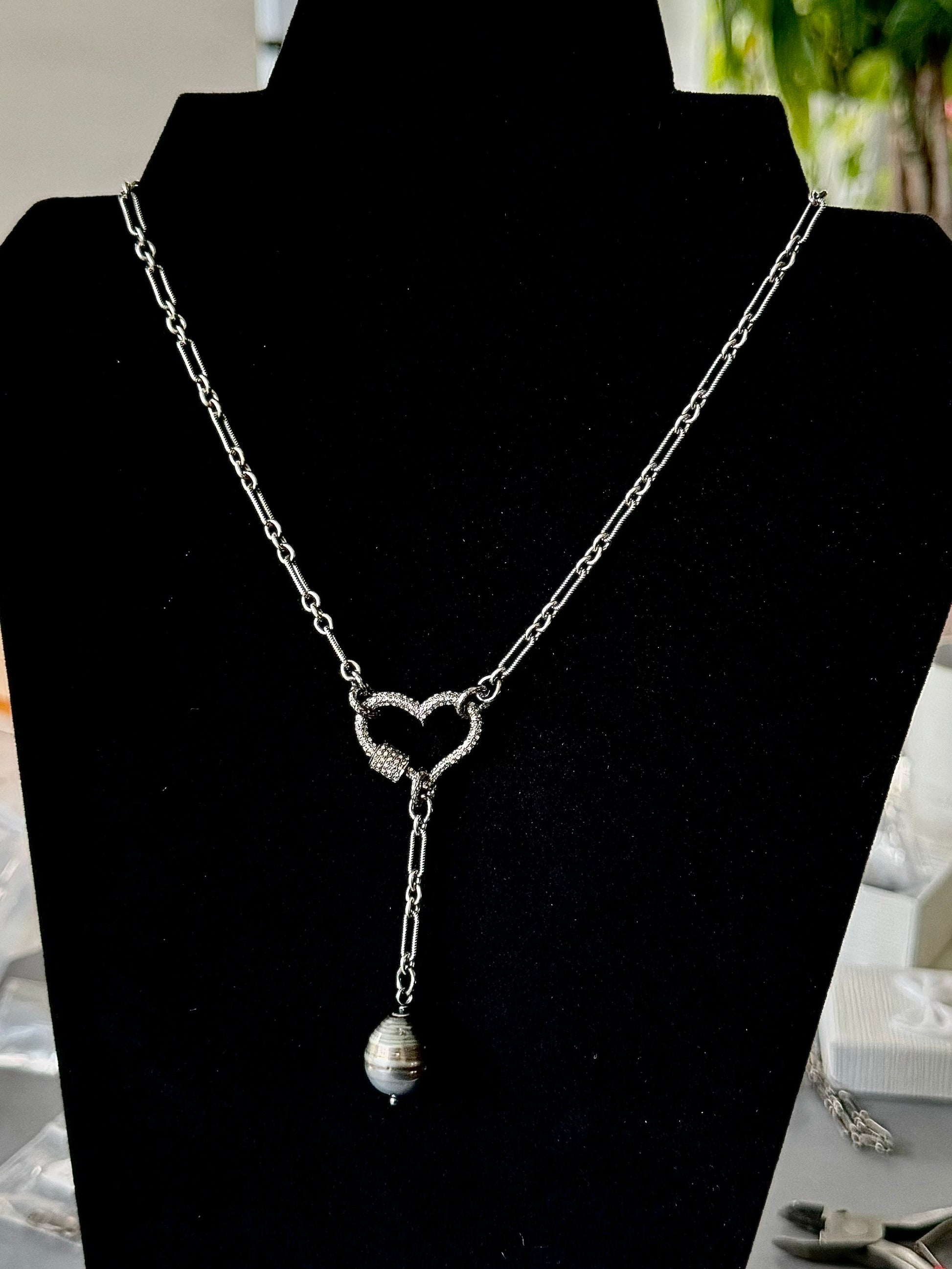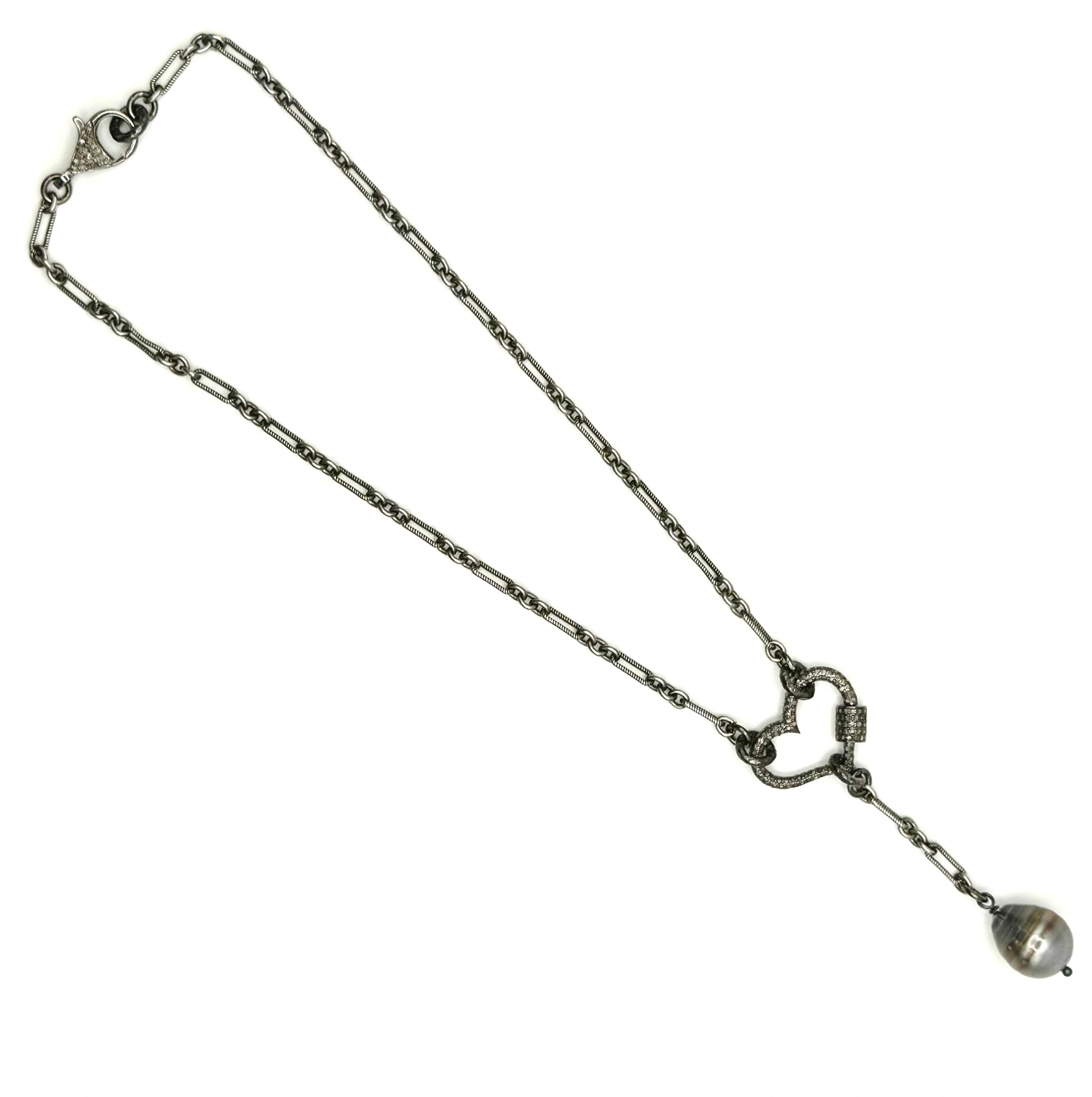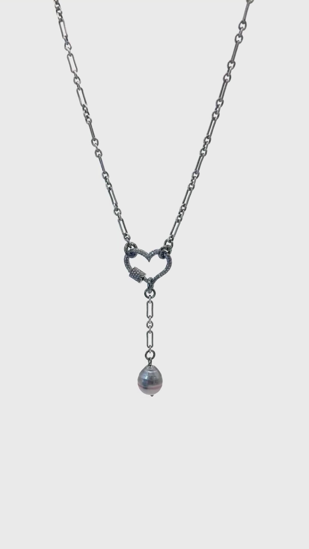 Introducing our Grey Drop Tahitian Pearl Necklace, featuring a mesmerizing 14mm pearl. Enhanced with a Pave Diamond Studded Oxidized Sterling Silver Heart Carabiner for celestial charm. Crafted on a 16" Oxidized Sterling Silver Twisted Paperclip Chain, blending contemporary style with timeless elegance. Secured with a Pave Diamond Studded Oxidized Sterling Silver Lobster Clasp.