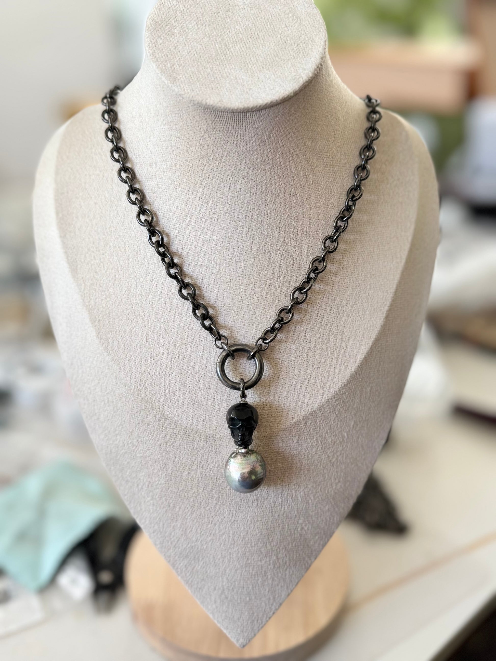Command attention with the Obsidian Phantom Necklace, a striking union of mystique and elegance. A hand-carved black obsidian skull anchors this design, paired with a luminous 17mm silver baroque Tahitian pearl that radiates bold sophistication. Suspended from a black rhodium plated sterling silver cable link chain, this necklace embodies Studio Javo’s vision of pearls as powerful, unisex statements.