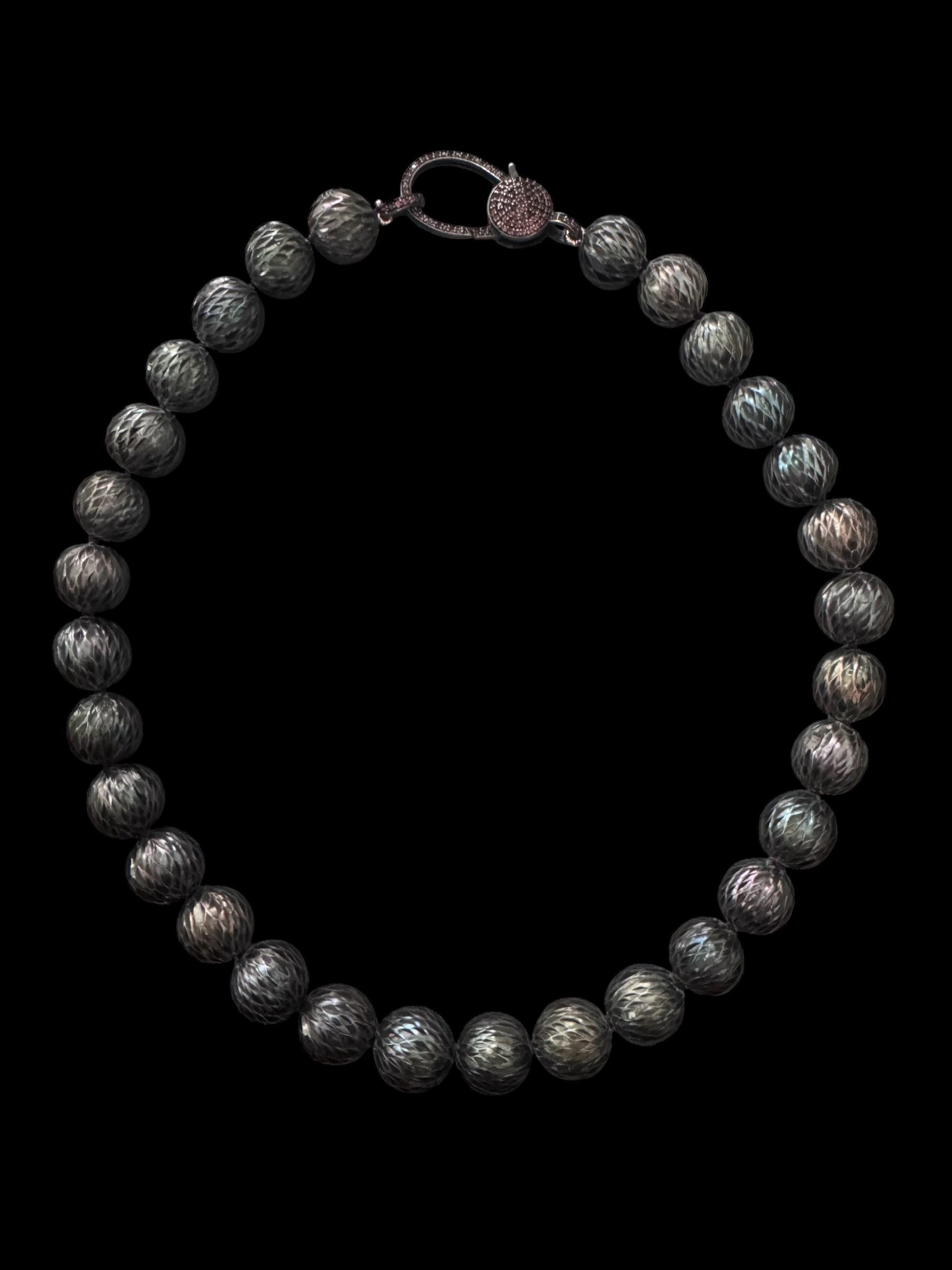 The Obsidian Scale necklace captures light and shadow in an extraordinary display of craftsmanship. Each 11–14mm Edison pearl is meticulously hand-carved in a rare dragonscale pattern, creating a multidimensional surface that ripples with deep peacock tones—steel gray, violet, and mossy green. The sculptural pearls are finished with a pavé rhodolite garnet clasp set in oxidized sterling silver, adding a subtle shimmer and tonal richness. Bold yet refined, Obsidian Scale offers a new way to wear pearls: unexpected, contemporary, and full of character.