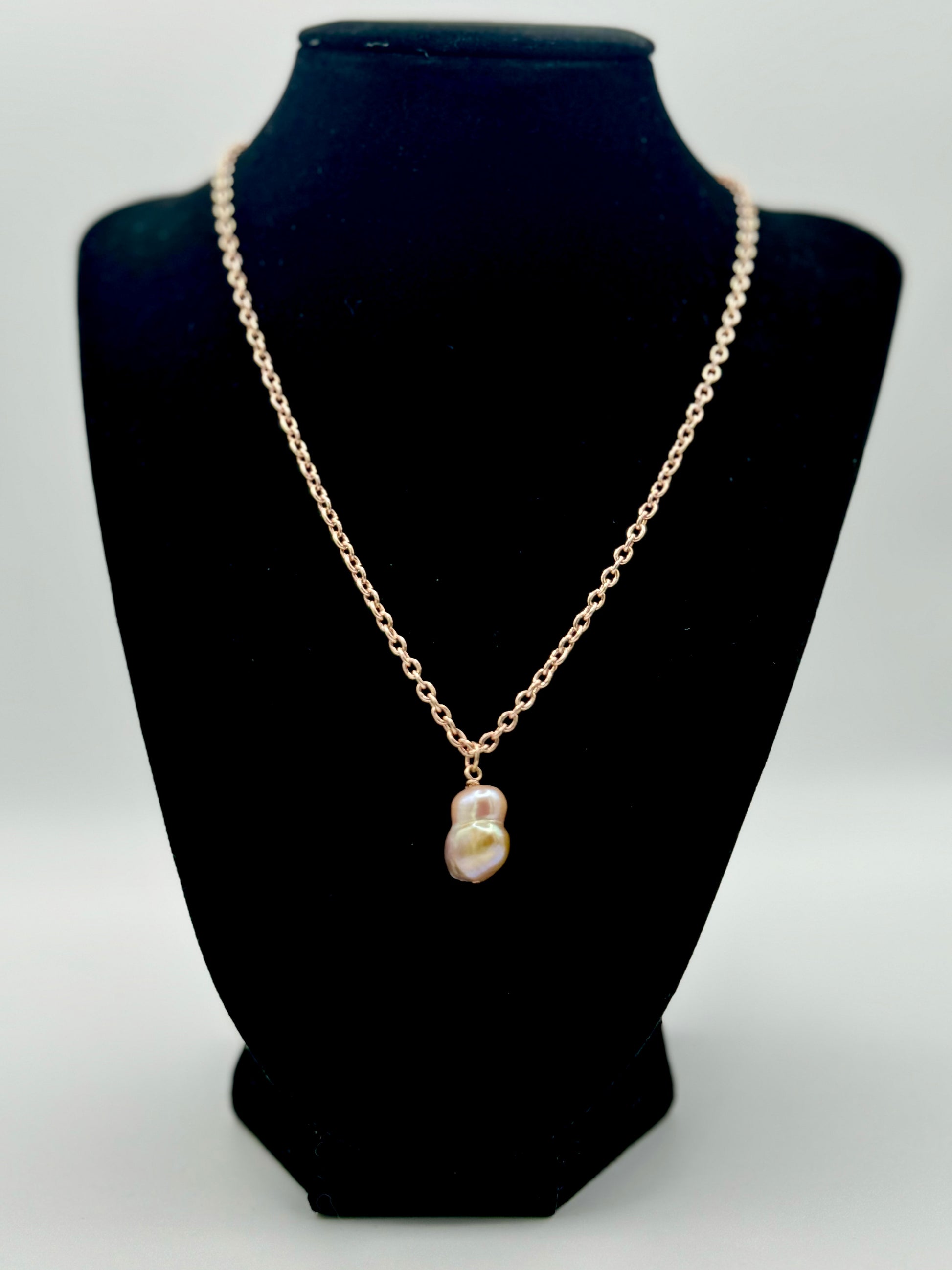 Add a touch of whimsy with our Peanut Pearl necklace, featuring a unique rose gold cable link chain and a stunning peanut-shaped pearl. Perfect for adding a playful twist to any outfit. (Peanut allergies not included!)