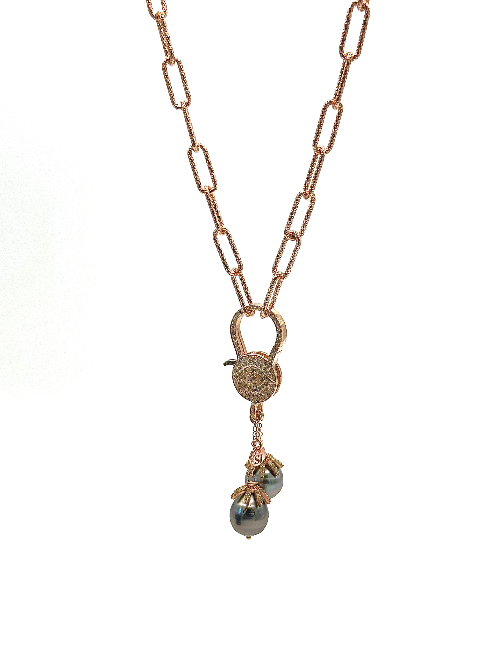 Expertly crafted, this necklace features a stunning rose gold evil eye diamond clasp paired with lustrous rose grey Tahitian pearls and diamond caps. Made with a brilliant diamond cut chain, this necklace exudes luxury and charm. Protect yourself with the evil eye while looking effortlessly chic.
