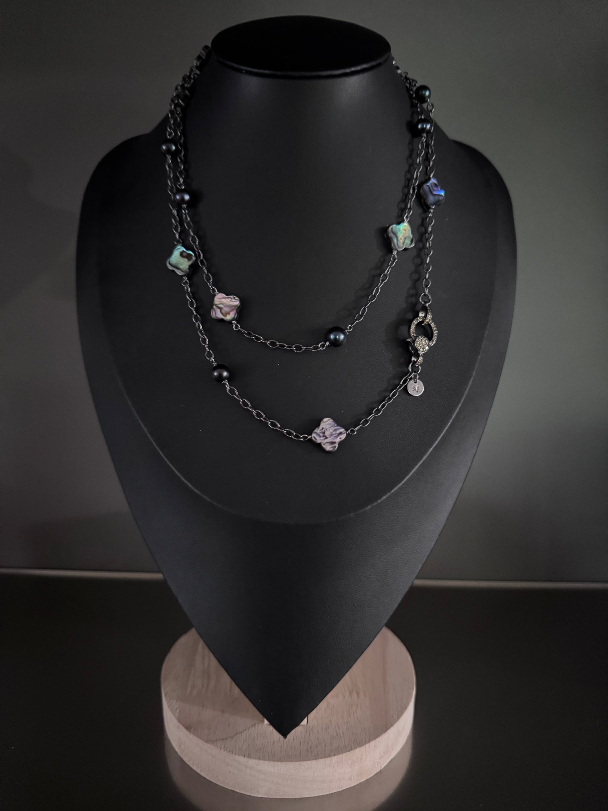 A striking play of light and dark, the Shadow Bloom necklace features iridescent 12mm abalone clovers paired with 7.5–8mm black freshwater pearls. Each lustrous element is stationed along a black rhodium-plated silver twisted link chain, connected by an oxidized silver pavé tourmaline clasp. The contrast of glistening organic forms and dark metals evokes an edgy elegance—where oceanic shimmer meets urban sophistication.