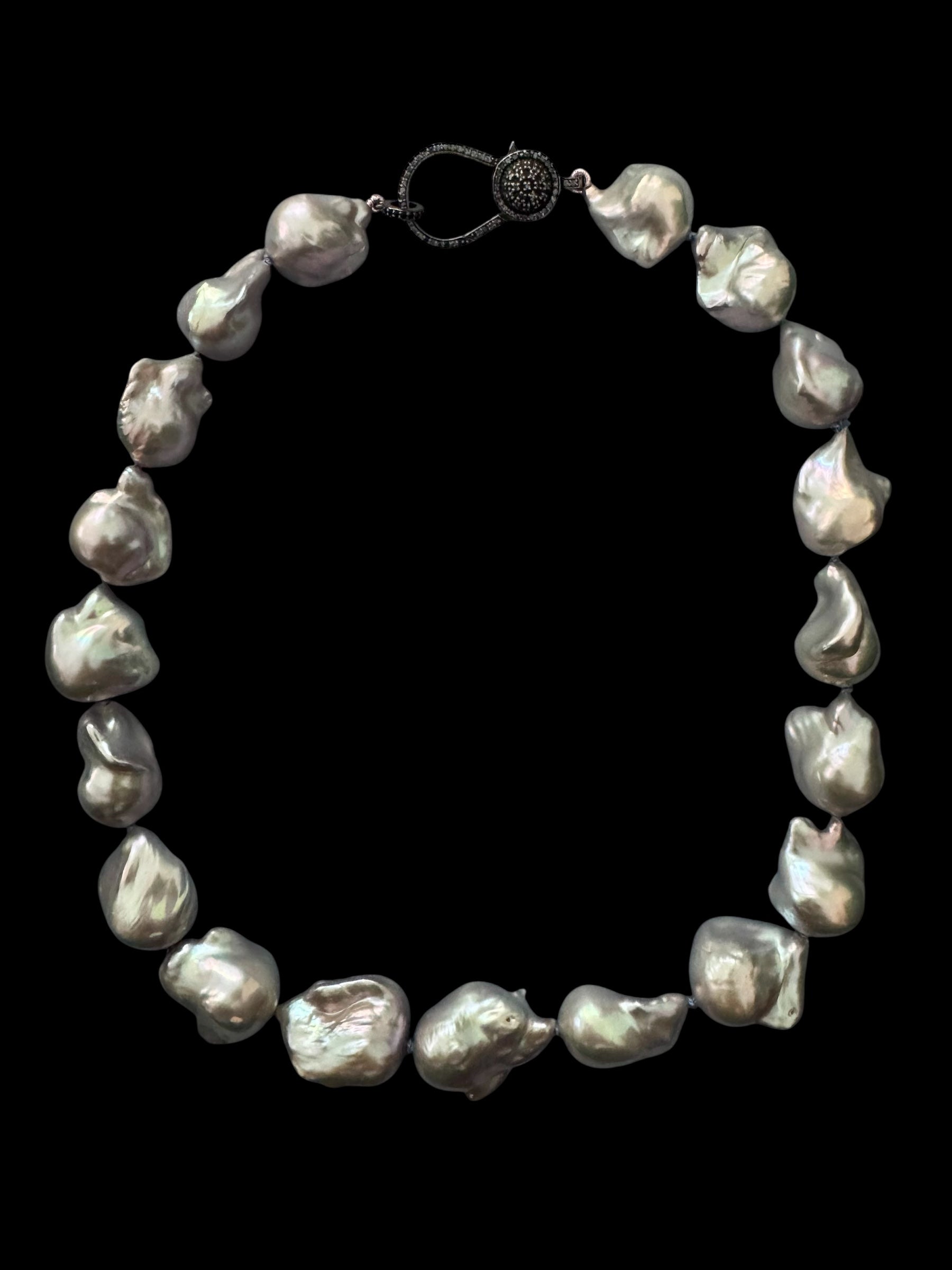 Command attention with the Silver Tempest, a bold strand of 16–18mm natural silver-blue baroque freshwater pearls. Each pearl showcases unique, organic curves with a mesmerizing metallic luster that shifts from silver to glacial blue in the light. Finished with a striking oxidized silver clasp set with pavé sapphires, this piece celebrates contrast—elegant and untamed, refined and powerful.