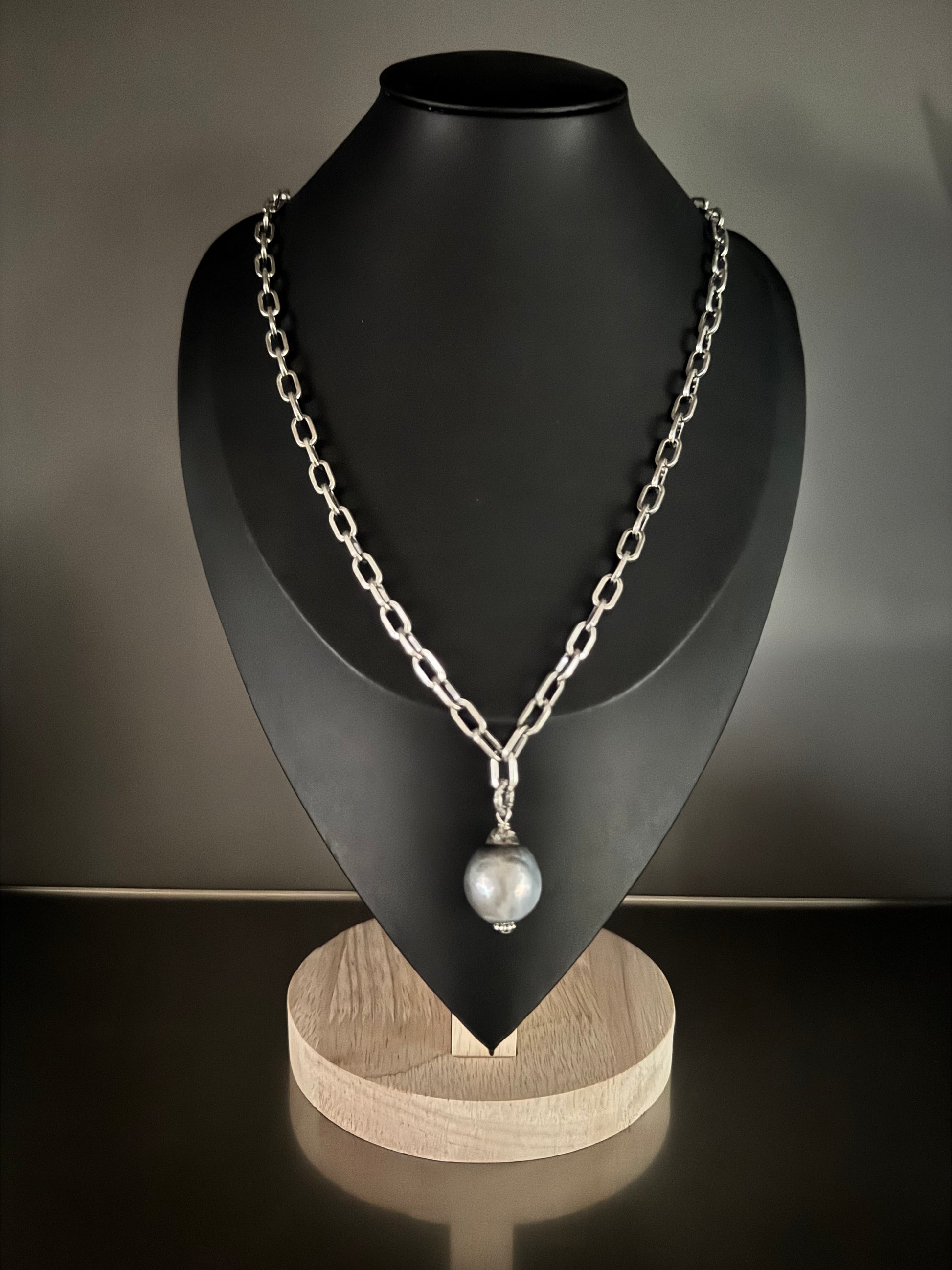 Commanding yet refined, the Silver Titan Necklace brings a bold new edge to classic pearl jewelry. Featuring a striking 17mm silver baroque Tahitian pearl suspended from a sterling silver paperclip chain, this design balances raw strength with modern sophistication. The pearl’s natural luster radiates against the clean geometry of the 10x6mm chain, secured with a shimmering pavé diamond lobster clasp.