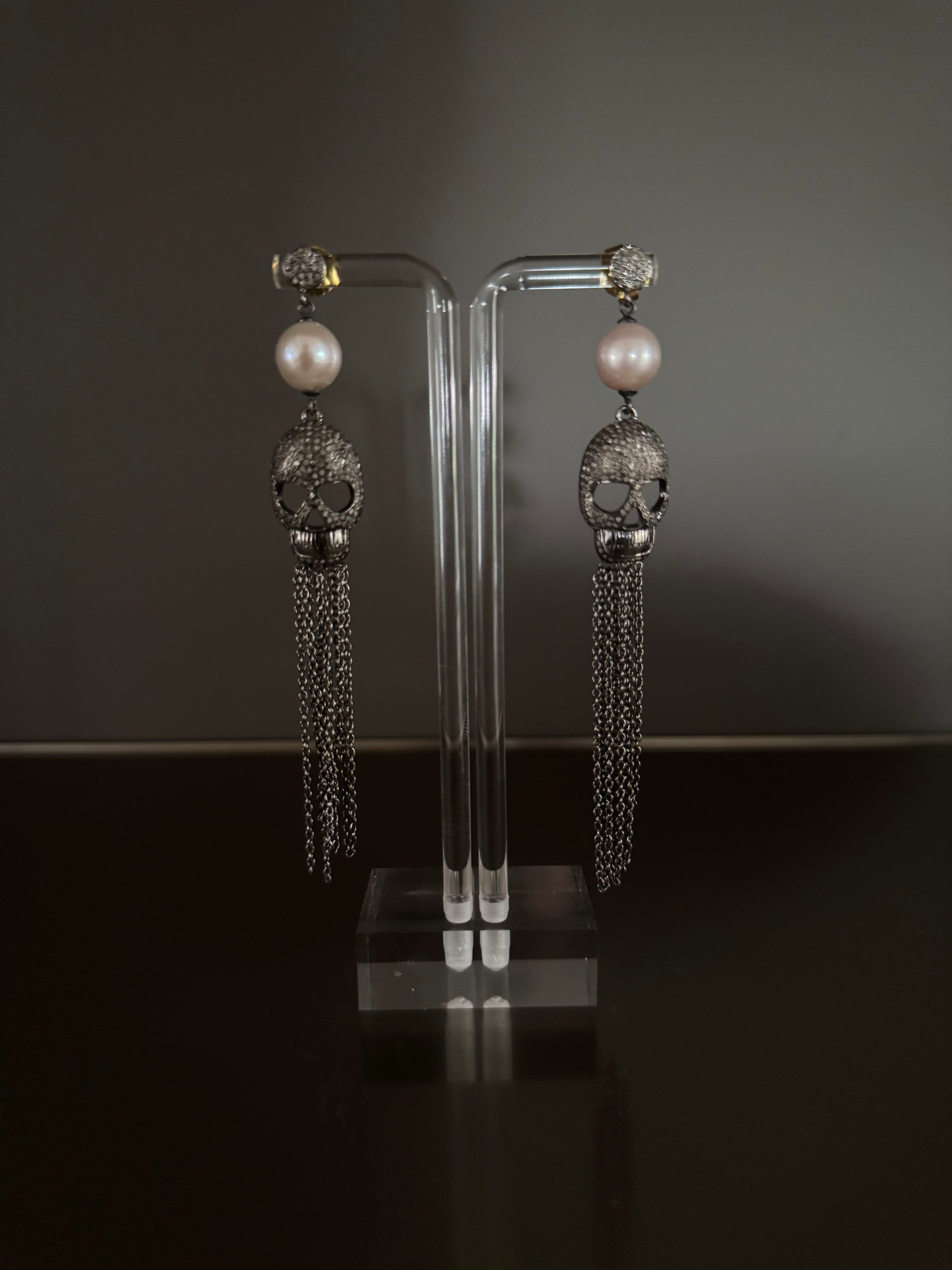 White Edison pearls glow with quiet radiance above pavé diamond skulls, their brilliance softened by the depth of oxidized silver. Cascading chain tassels fall like shadows in motion, bringing drama and fluidity to each turn. A design that weaves light and darkness together, embodying both elegance and edge.