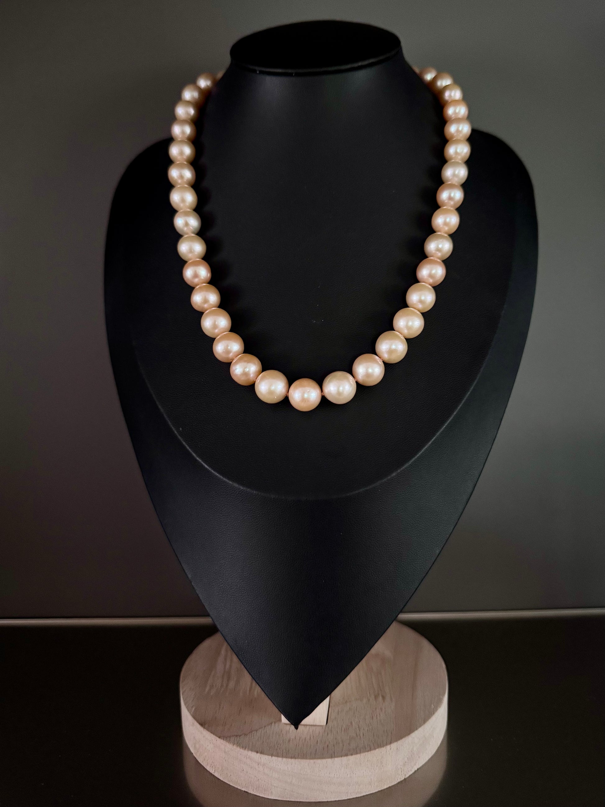 Glowing with warm golden-peach tones, Solar Reign features a strand of 10–12mm Edison pearls that radiate with exceptional luster and soft metallic sheen. Their smooth round shape and rich hues bring warmth and elegance to the forefront.