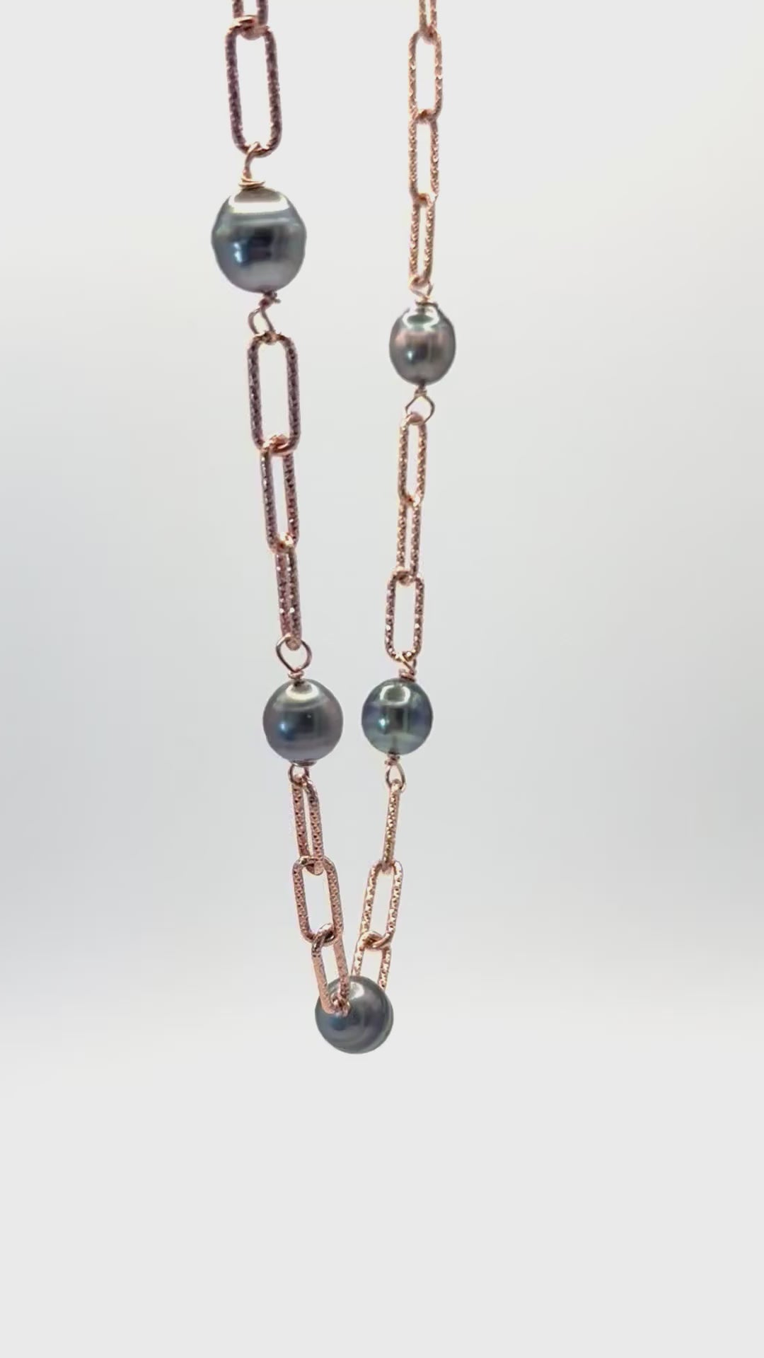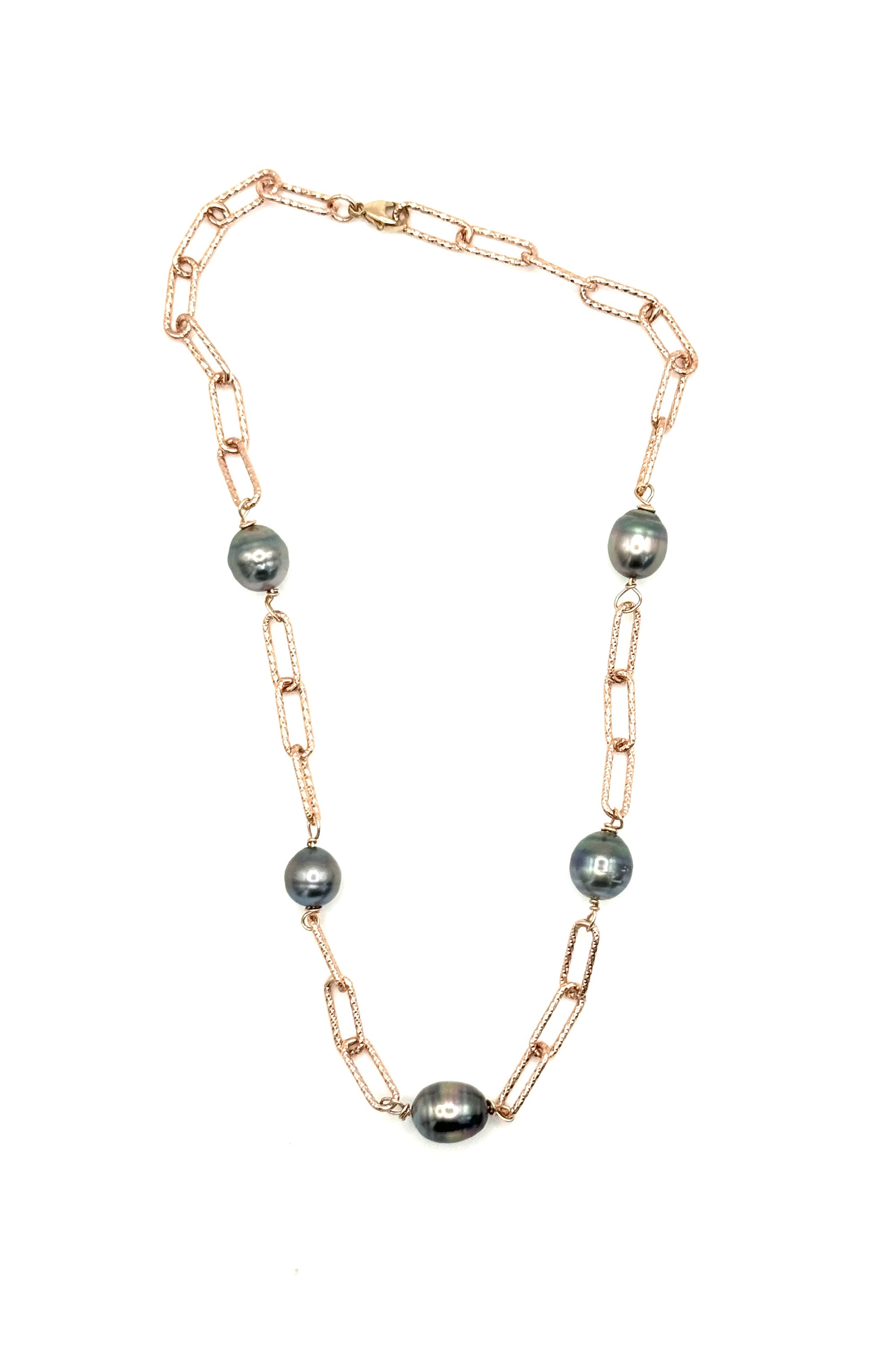 Tahitian Tranquility Necklace: Rose Gold Textured Paperclip Chain with Grey Tahitian Pearls