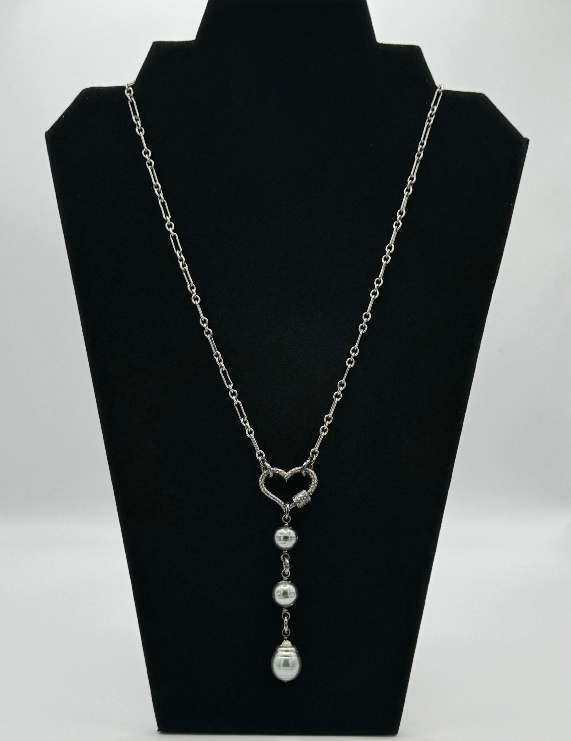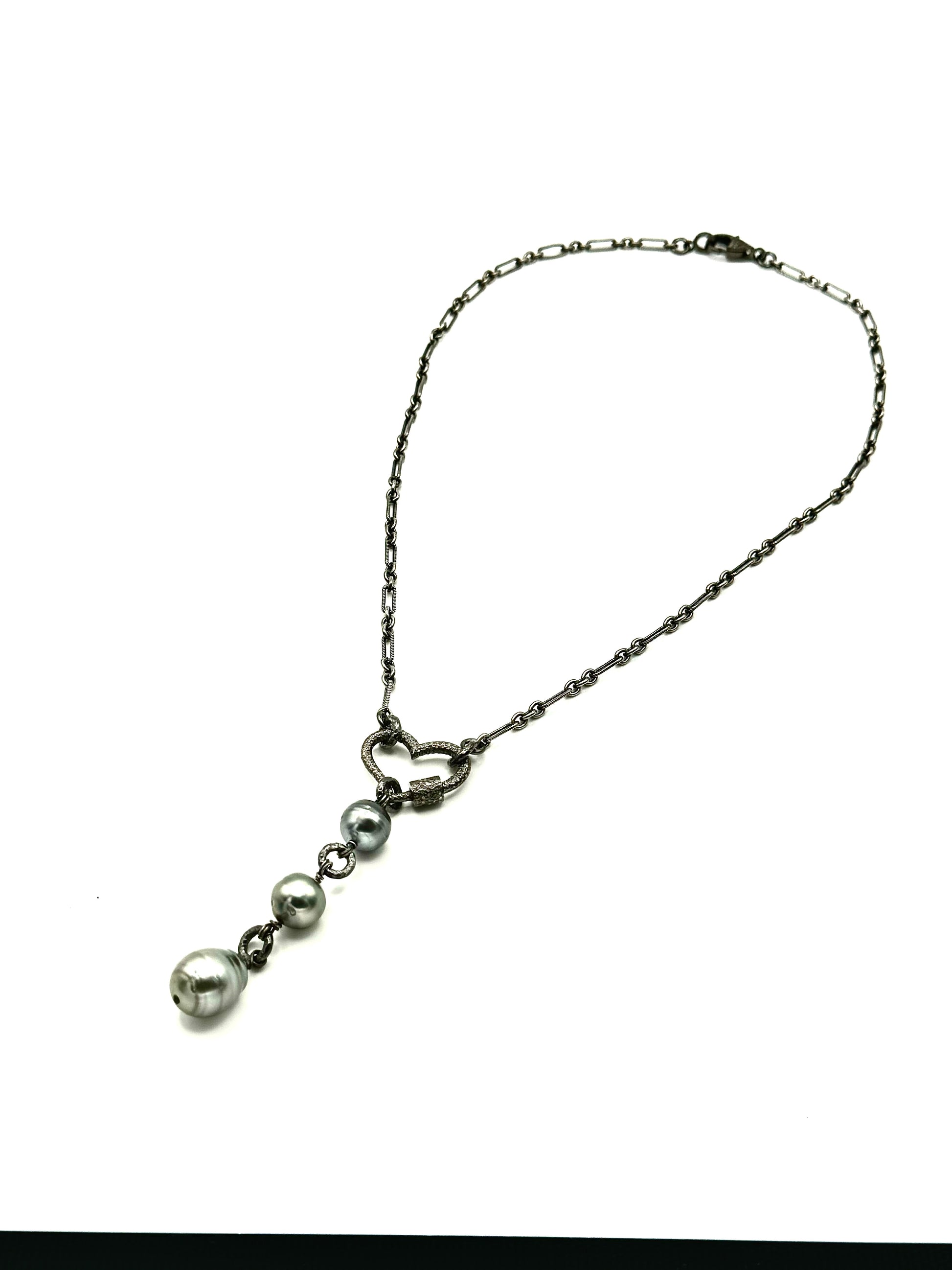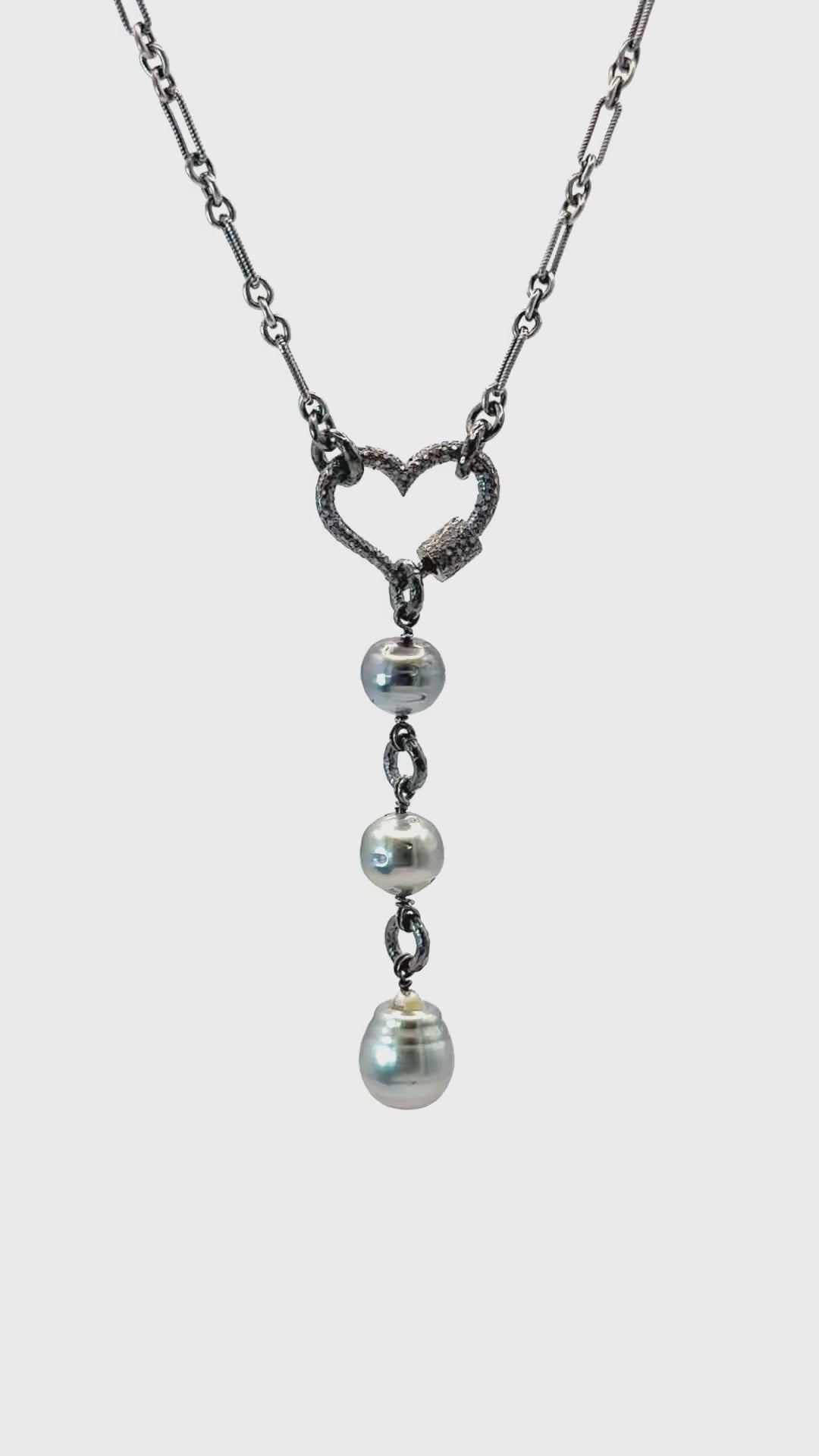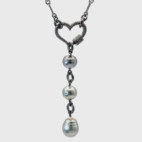 Introducing our exquisite Tahitian Pearl Necklace, featuring 14mm Gray Tahitian Drop Pearls and 12mm Gray Button Round Tahitian Pearls. Adorned with a Diamond Studded Oxidized Sterling Silver Heart and secured with a Diamond Studded Oxidized Sterling Silver Lobster Clasp.