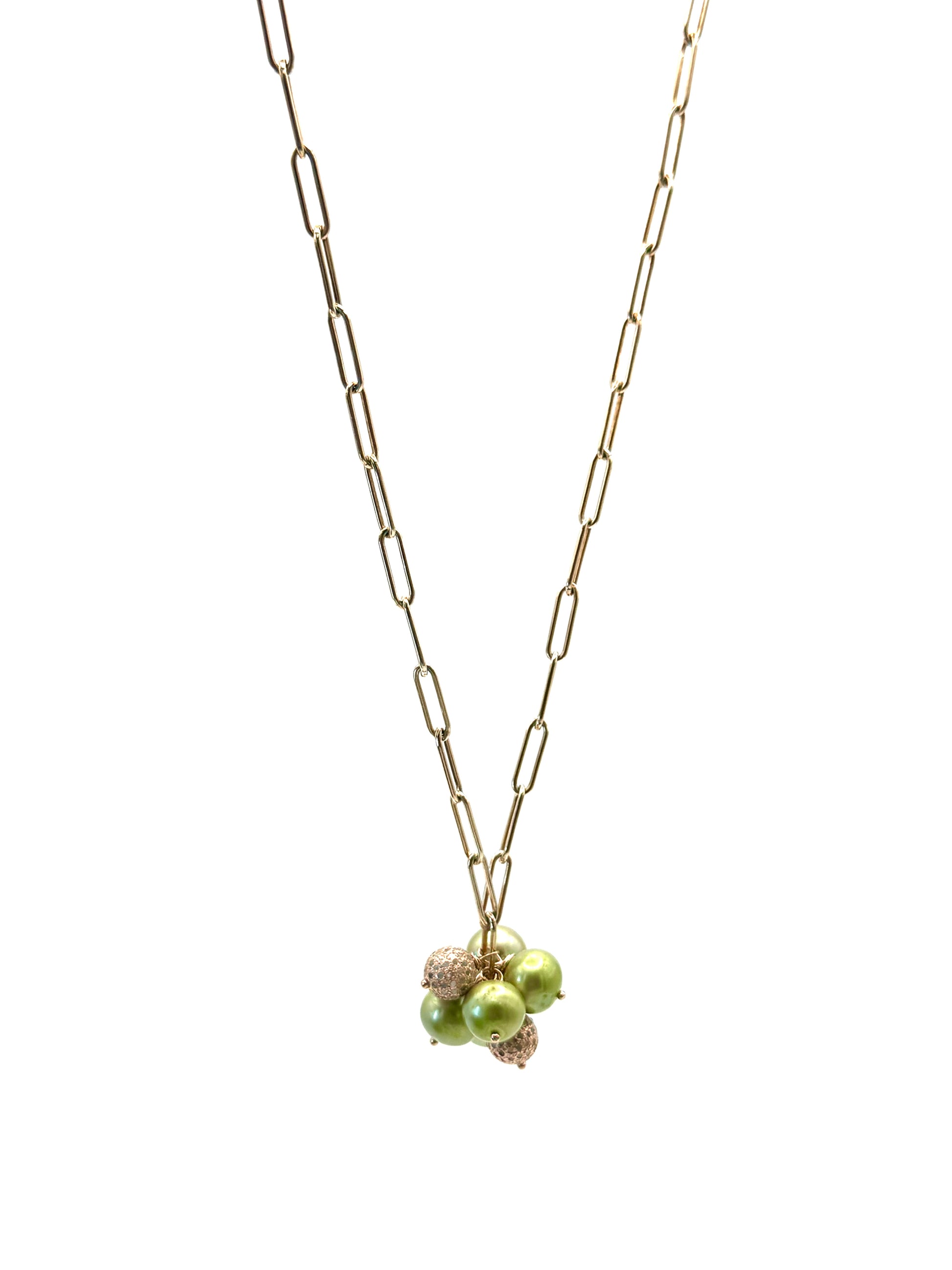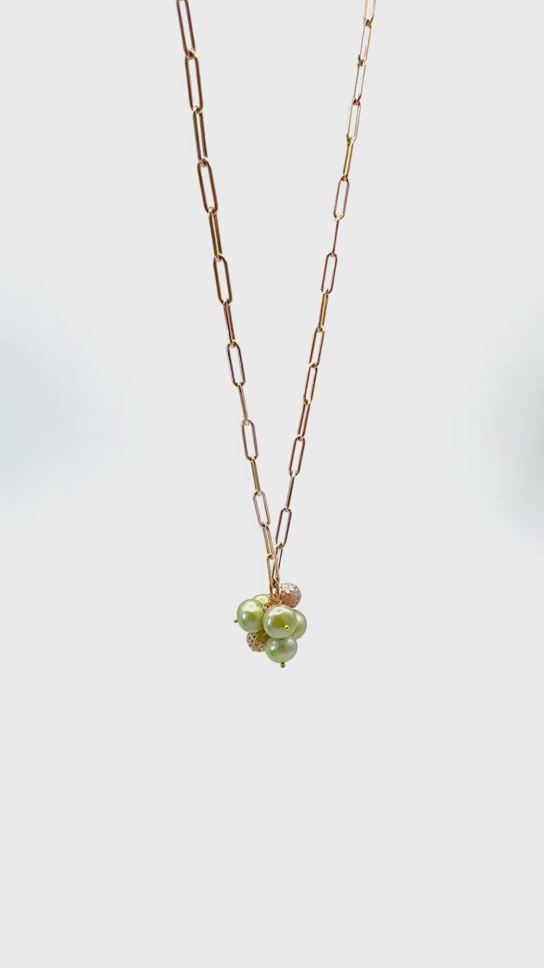 Verdant Gleam Necklace: Rose Gold Paperclip Necklace with Light Green Pearls & Diamond Beads
