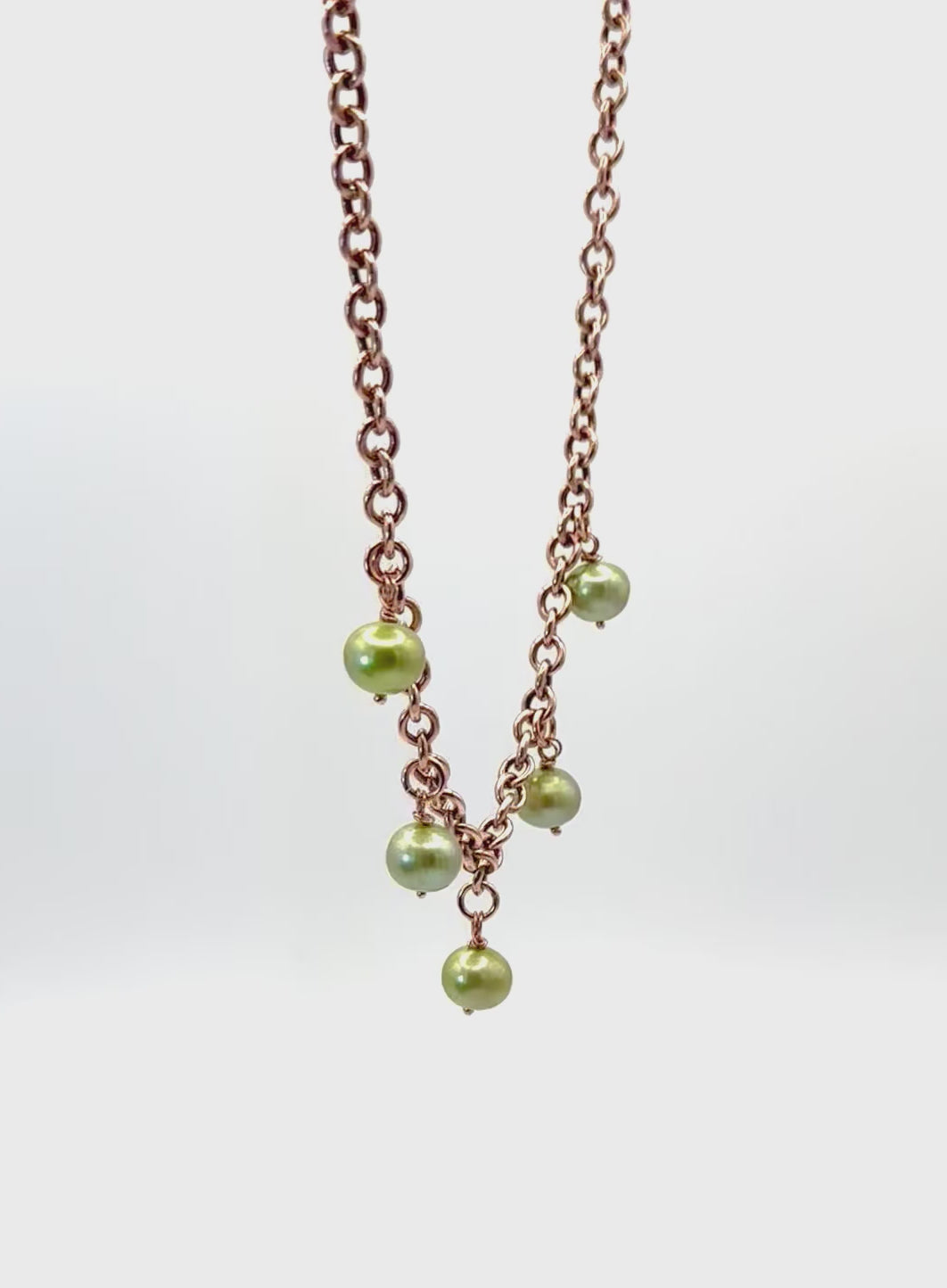 Shimmer with modern charm in our Verdant Radiance Necklace. Featuring a playful mix of bold Rose Gold and light green freshwater pearls, this necklace will add a unique touch to any outfit. Stand out from the crowd and radiate confidence with our stunning design.