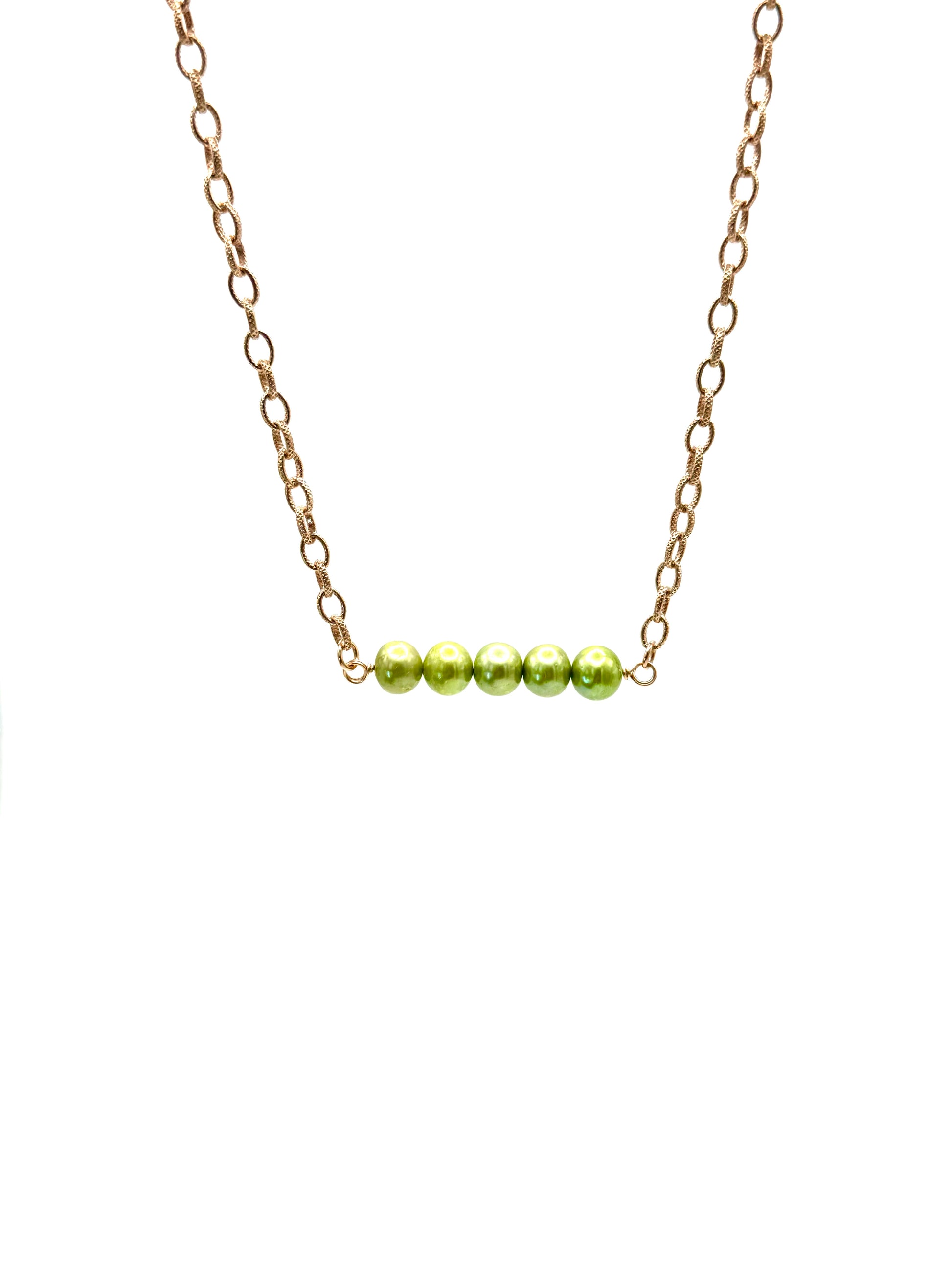 Contemporary Light Green Freshwater Pearls on Rose Gold Bar Necklace