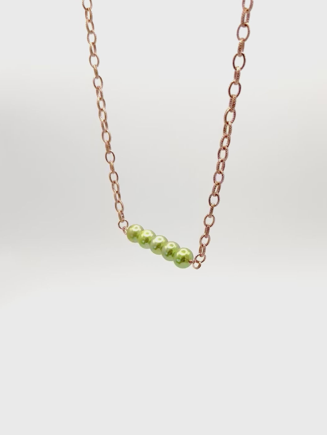 Add a playful touch to any outfit with our quirky Contemporary Light Green Freshwater Pearls on Rose Gold Bar Necklace. Adorned with contemporary light green freshwater pearls, this necklace will make you stand out in style. The rose gold chain adds a touch of elegance, making it perfect for any occasion. (You'll be the envy of all your friends!)